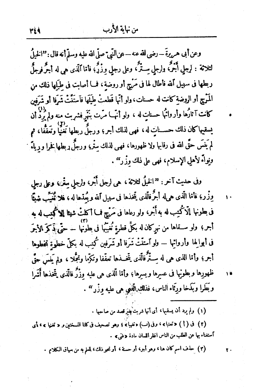 وفى حديث آخر: «الخيل لثلاثة، هى لرجل أجر، ولرجل ستر؛ وعلى رجل وزر؛ فأمّا الذى هى له أجر فالّذى يتّخذها فى سبيل الله ويعدّها له، فلا تغيّب شيئا فى بطونها إلّا كتب له به أجر، ولو رعاها فى مرج فما أكلت شيئا إلا كتب له به أجر؛ ولو سقاها من نهر كان له بكلّ قطرة تغيّبها فى بطونها «3» - حتّى ذكر الأجر فى أبو الها وأرواثها- ولو استنّت شرفا أو شرفين كتب له بكلّ خطوة تخطوها أجر؛ وأمّا الذى هى له ستر فالّذى يتّخذها تعفّفا وتكرّما وتجمّلا، ولم ينس حقّ ظهورها وبطونها فى عسرها ويسرها؛ وأمّا الذى هى عليه وزر فالّذى يتّخذها أشرا وبطرا وبذخا ورئاء الناس، فذلك الذى هى عليه وزر» .