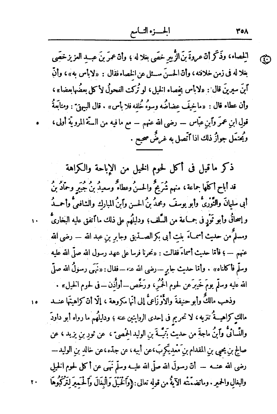 الخصاء، وذكر أنّ عروة بن الزّبير خصى بغلا له؛ وأنّ عمر بن عبد العزيز خصى بغلا له فى زمن خلافته، وأنّ الحسن سئل عن الخصاء فقال: «لا بأس به» ، وأنّ ابن سيرين قال: «لا بأس بخصاء الخيل، لو تركت الفحول لأكل بعضها بعضا» ، وأن عطاء قال: «ما خيف عضاضه وسوء خلقه فلا بأس» . قال البيهقىّ: ومتابعة قول ابن عمر وابن عبّاس- رضى الله عنهم- مع ما فيه من السنّة المرويّة أولى، ويحتمل جواز ذلك اذا اتّصل به غرض صحيح.