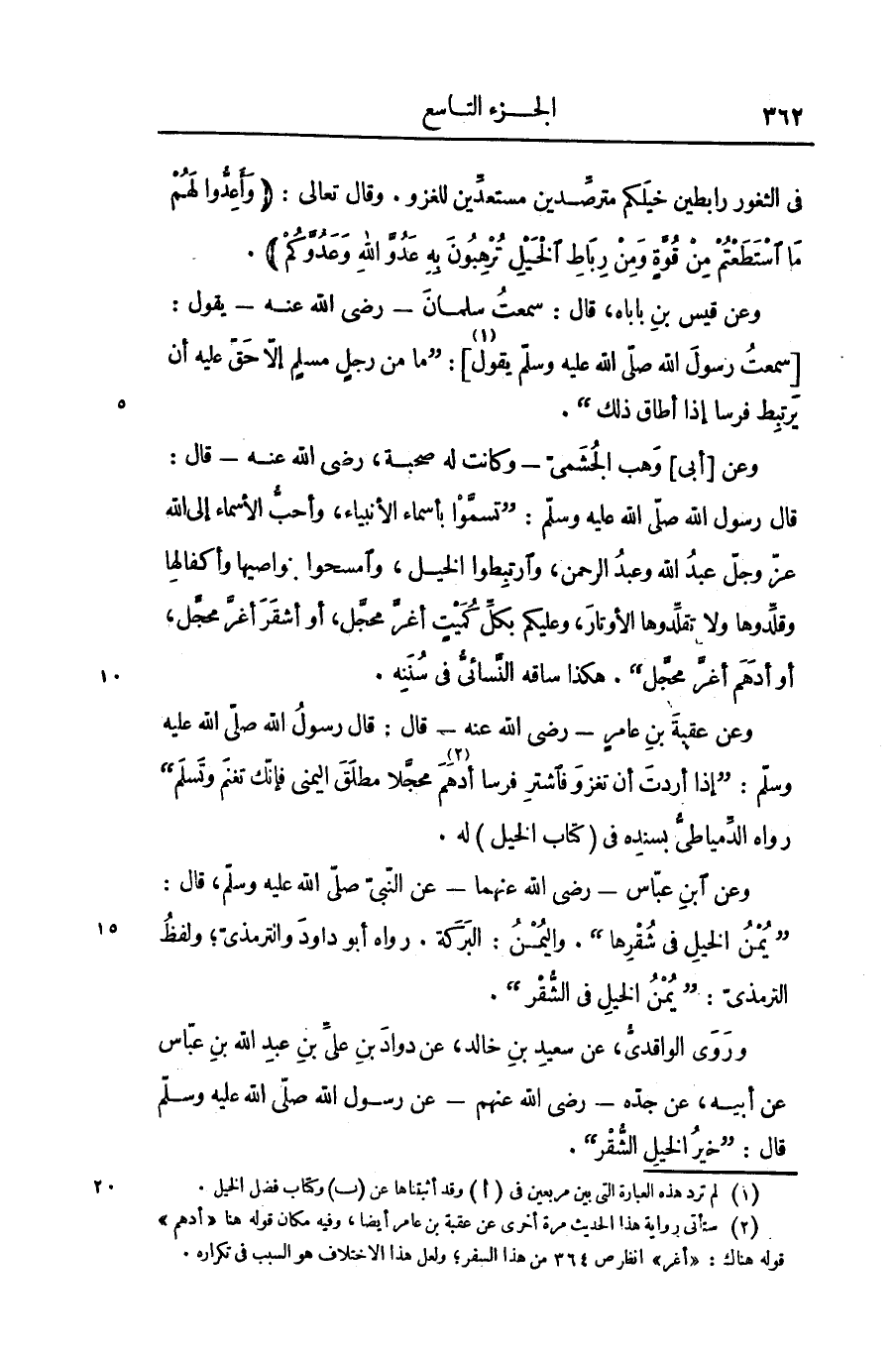 قال رسول الله صلى الله عليه وسلم: «تسمّوا بأسماء الأنبياء، وأحبّ الأسماء إلى الله عزّ وجلّ عبد الله وعبد الرحمن، وارتبطوا الخيل، وامسحوا بنواصيها وأكفالها وقلّدوها ولا تقلّدوها الأوتار، وعليكم بكلّ كميت أغرّ محجّل، أو أشقر أغرّ محجّل، أو أدهم أغرّ محجّل» . هكذا ساقه النّسائىّ فى سننه.