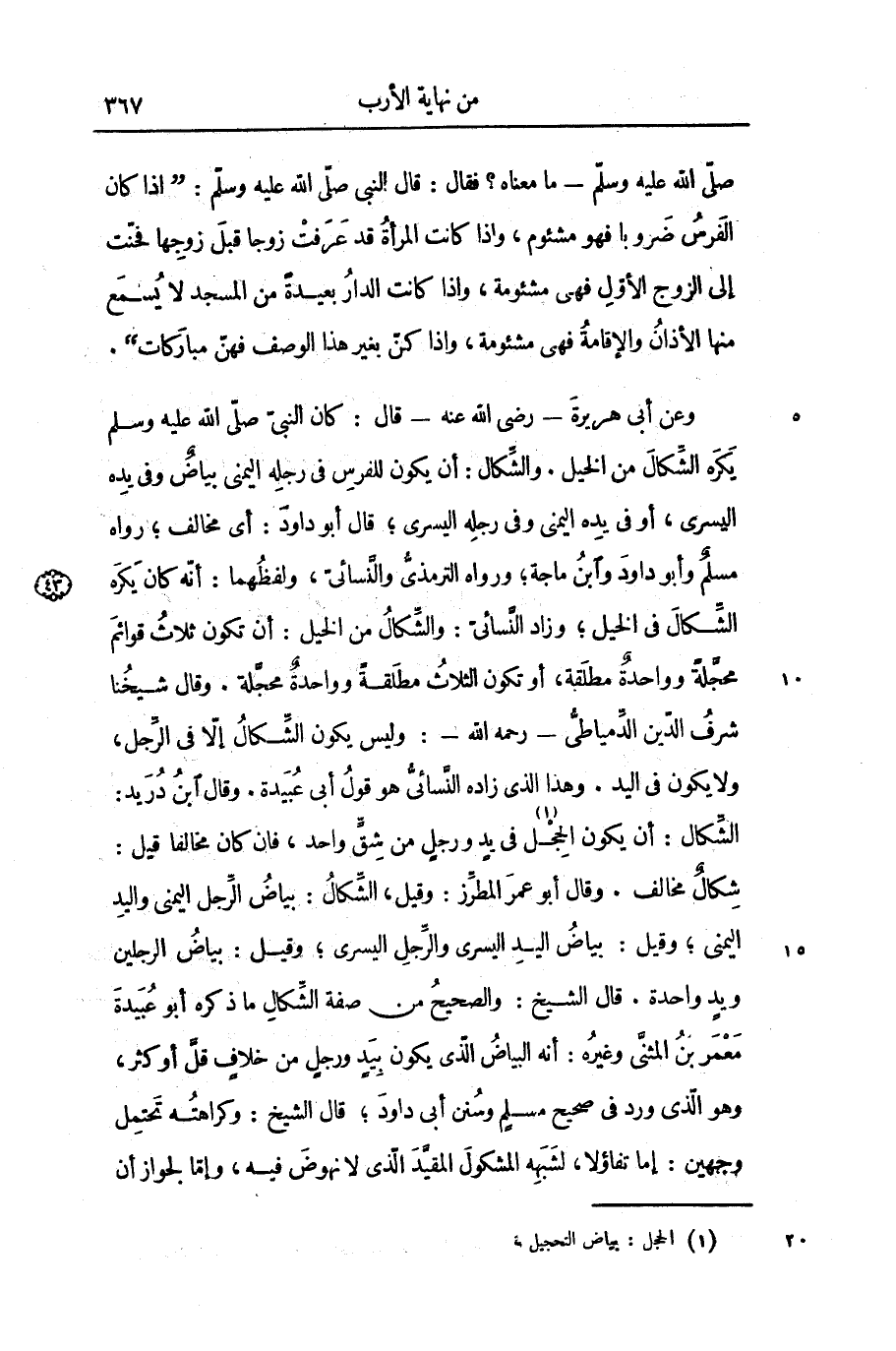 وعن أبى هريرة- رضى الله عنه- قال: كان النّبىّ صلى الله عليه وسلم يكره الشّكال من الخيل. والشّكال: أن يكون للفرس فى رجله اليمنى بياض وفى يده اليسرى، أو فى يده اليمنى وفى رجله اليسرى؛ قال أبو داود: أى مخالف؛ رواه مسلم وأبو داود وابن ماجة؛ ورواه الترمذىّ والنّسائىّ، ولفظهما: أنّه كان يكره الشّكال فى الخيل؛ وزاد النّسائىّ: والشّكال من الخيل: أن تكون ثلاث قوائم محجّلة وواحدة مطلقة، أو تكون الثلاث مطلقة وواحدة محجّلة. وقال شيخنا شرف الدّين الدّمياطىّ- رحمه الله-: وليس يكون الشّكال إلّا فى الرّجل، ولا يكون فى اليد. وهذا الذى زاده النّسائىّ هو قول أبى عبيدة. وقال ابن دريد: