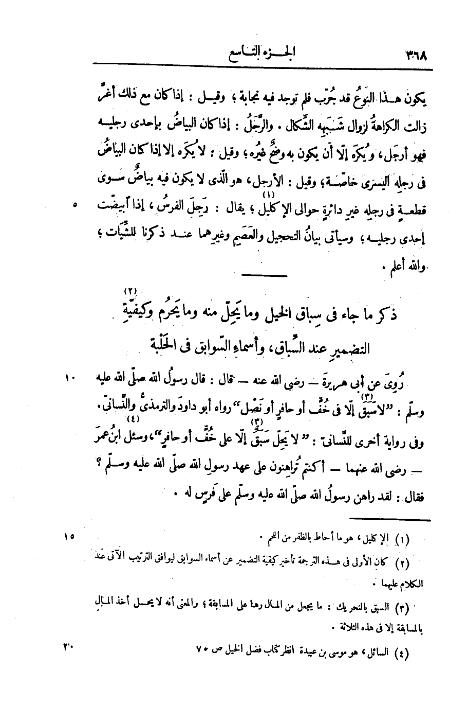 ذكر ما جاء فى سباق الخيل وما يحلّ منه وما يحرم وكيفيّة «2» التضمير عند السّباق، وأسماء السّوابق فى الحلبة