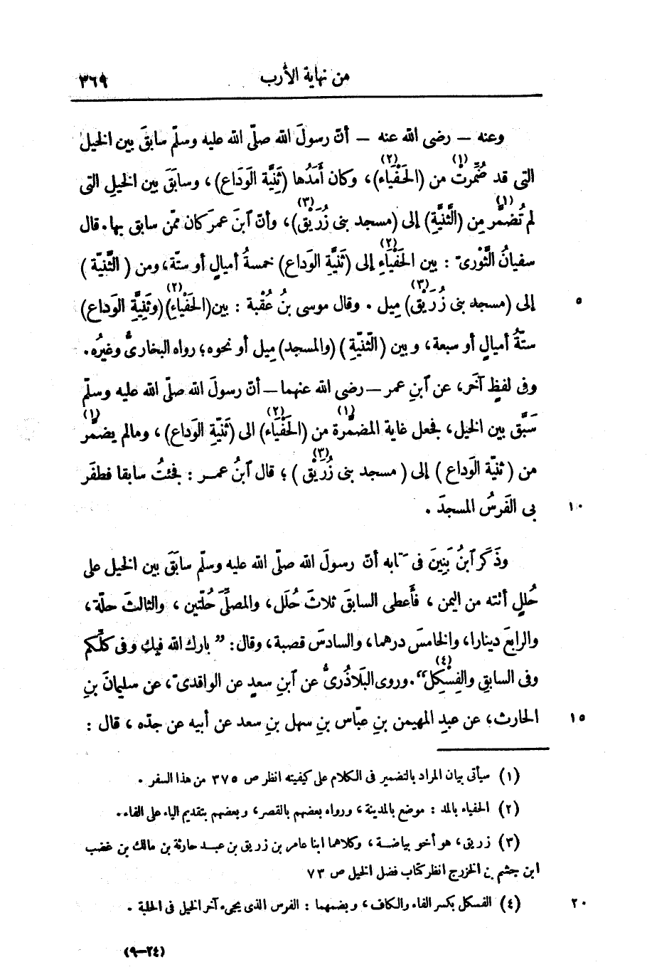 وعنه- رضى الله عنه- أنّ رسول الله صلى الله عليه وسلم سابق بين الخيل التى قد ضمّرت «1» من (الحفياء «2» ) ، وكان أمدها (ثنيّة الوداع) ، وسابق بين الخيل التى لم تضمّر «3» من (الثّنيّة) إلى (مسجد بنى زريق «4» ) ، وأنّ ابن عمر كان ممّن سابق بها. قال سفيان الثّورىّ: بين الحفياء «5» إلى (ثنيّة الوداع) خمسة أميال أو ستّة، ومن (الثّنيّة) إلى (مسجد بنى زريق «6» ) ميل. وقال موسى بن عقبة: بين (الحفياء «7» ) (وثنيّة الوداع) ستّة أميال أو سبعة، وبين (الثّنيّة) (والمسجد) ميل أو نحوه؛ رواه البخارىّ وغيره.
