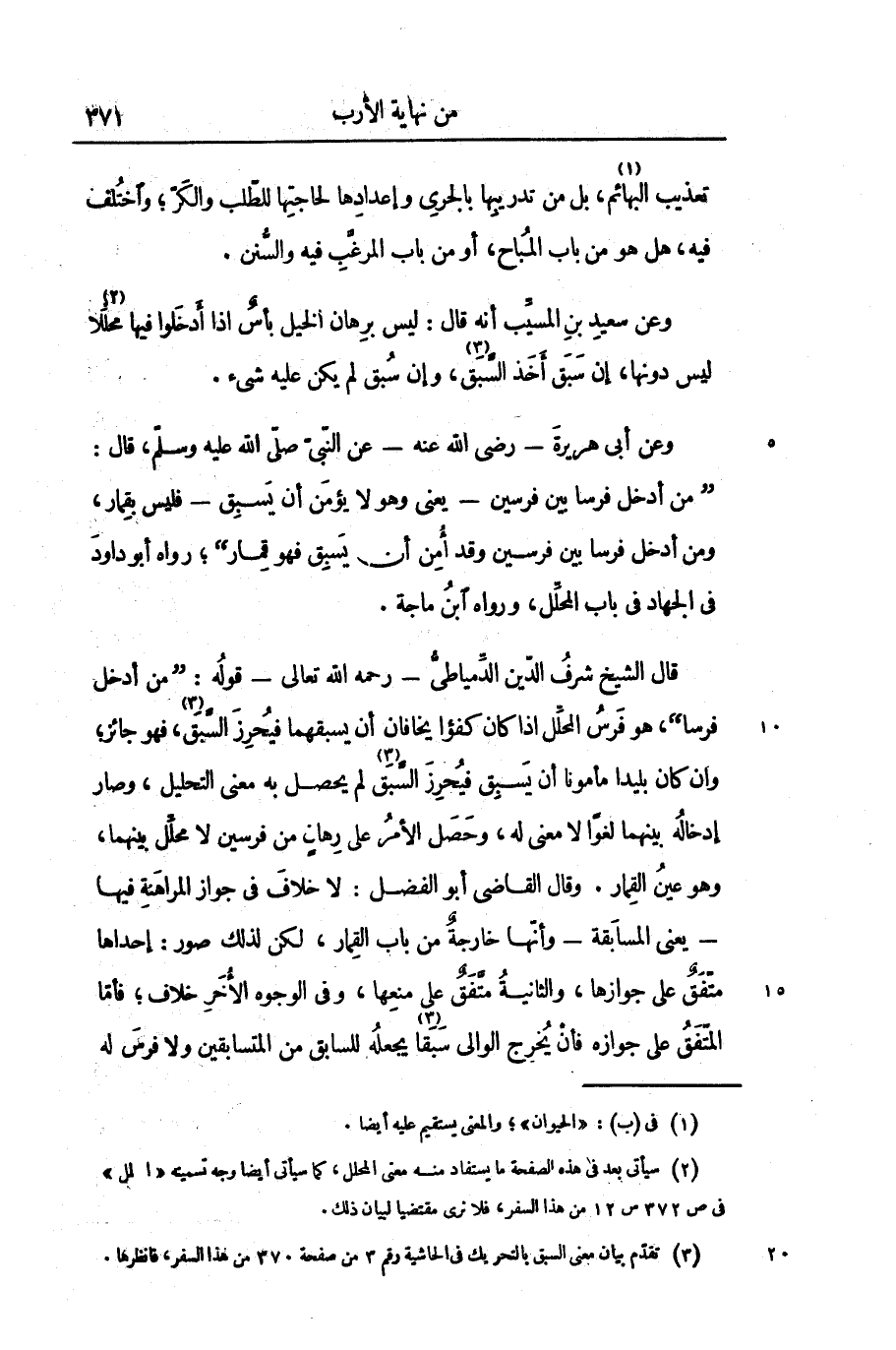 وعن سعيد بن المسيّب أنه قال: ليس برهان الخيل بأس اذا أدخلوا فيها محلّلا «2» ليس دونها، إن سبق أخذ السّبق «3» ، وإن سبق لم يكن عليه شىء.