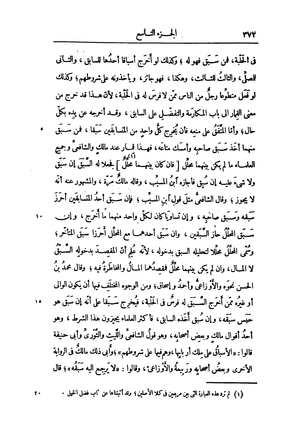 فى الحلبة، فمن سبق فهو له؛ وكذلك لو أخرج أسباقا أحدها للسابق، والثانى للمصلّى، والثالث للثالث، وهكذا، فهو جائز، ويأخذونه على شروطهم؛ وكذلك لو فعل متطوّعا رجل من الناس ممّن لا فرس له فى الحلبة، لأنّ هذا قد خرج من معنى القمار الى باب المكارمة والتفضّل على السابق، وقد أخرجه عن يده بكلّ حال؛ وأمّا المتّفق على منعه فأن يخرج كلّ واحد من المتسابقين سبقا، فمن سبق منهما أخذ سبق صاحبه وأمسك متاعه، فهذا قمار عند مالك والشافعىّ وجميع العلماء ما لم يكن بينهما محلّل [فان كان بينهما «1» محلّل] فجعلا له السّبق إن سبق ولا شىء عليه إن سبق فأجازه ابن المسيّب، وقاله مالك مرّة، والمشهور عنه أنّه لا يجوز؛ وقال الشافعىّ مثل قول ابن المسيّب؛ فإن سبق أحد المتسابقين أحرز سبقه وسبق صاحبه، وإن تساويا كان لكلّ واحد منهما ما أخرج، وإن سبق المحلّل حاز السّبقين، وان سبق أحدهما مع المحلّل أحرزا سبق المتأخّر؛ وسمّى المحلّل محلّلا لتحليله السبق بدخوله، لأنّه علم أنّ المقصد بدخوله السّبق لا المال، وان لم يكن بينهما محلّل فمقصدهما المال والمخاطرة فيه؛ وقال محمد بن الحسن نحوه والأوزاعىّ وأحمد وإسحاق؛ ومن الوجوه المختلف فيها أن يكون الوالى أو غيره ممّن أخرج السّبق له فرس فى الحلبة، فيخرج سبقا على أنّه إن سبق هو حبس سبقه، وإن سبق أخذه السابق، فأكثر العلماء يجيزون هذا الشرط، وهو أحد أقوال مالك وبعض أصحابه، وهو قول الشافعىّ واللّيث والثّورىّ وأبى حنيفة قالوا: «الأسباق على ملك أربابها، وهم فيها على شروطهم» ؛ وأبى ذلك مالك فى الرواية الأخرى وبعض أصحابه وربيعة والأوزاعىّ، وقالوا: «لا يرجع اليه سبقه» ؛ قال