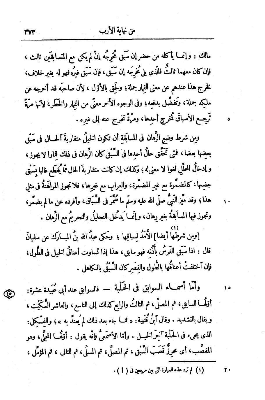 [ومن شرطها «1» أيضا] الأمد لسباقها؛ وحكى عبد الله بن المبارك عن سفيان قال: اذا سبق الفرس بأذنه فهو سابق، هذا إذا تساوت أعناق الخيل فى الطّول، فإن اختلفت أعناقها بالطّول والقصر كان السّبق بالكاهل.