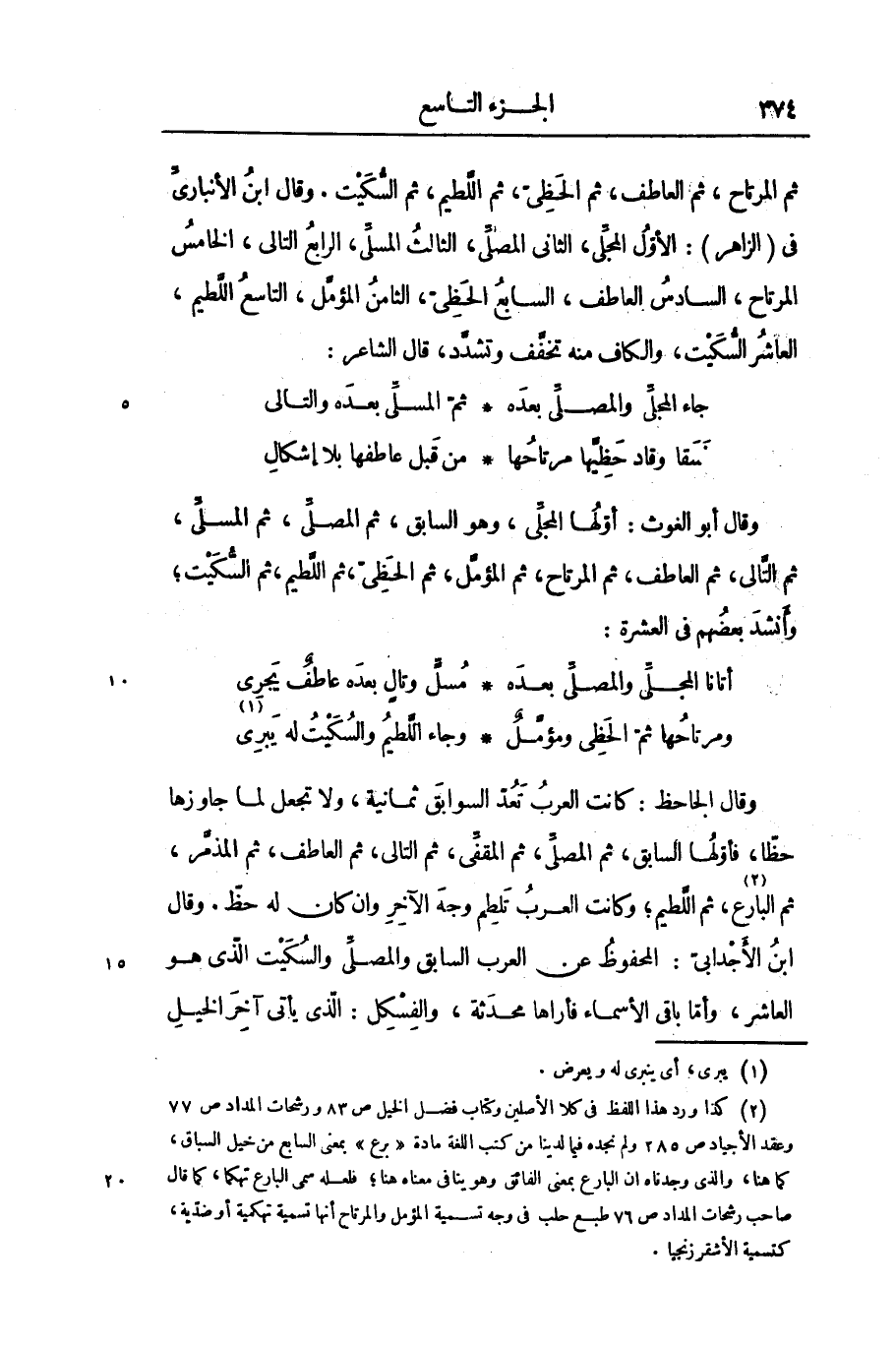 وقال الجاحظ: كانت العرب تعدّ السوابق ثمانية، ولا تجعل لما جاوزها حظّا، فأوّلها السابق، ثم المصلّى، ثم المقفّى، ثم التالى، ثم العاطف، ثم المذمّر، ثمّ البارع «2» ، ثم اللّطيم؛ وكانت العرب تلطم وجه الآخر وان كان له حظّ. وقال ابن الأجدابىّ: المحفوظ عن العرب السابق والمصلّى والسكيت الذى هو العاشر، وأمّا باقى الأسماء فأراها محدثة، والفسكل: الذى يأتى آخر الخيل
