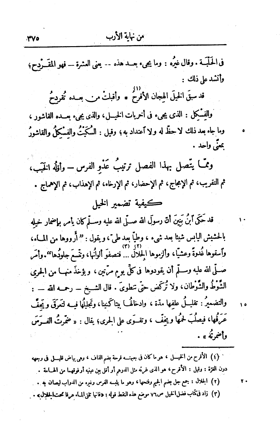 قد حكى ابن بنين أنّ رسول الله صلى الله عليه وسلم كان يأمر بإضمار خيله بالحشيش اليابس شيئا بعد شىء، وطيّا بعد طىّ، ويقول: «أرووها من الماء، واسقوها غدوة وعشيّا، وألزموها الجلال «2» ... «3» فتصفو ألوانها، وتتّسع جلودها» . وأمر صلّى الله عليه وسلم أن يقودوها فى كلّ يوم مرّتين، ويؤخذ منها من الجرى الشّوط والشّوطان، ولا تركض حتّى تنطوى. قال الشيخ- رحمه الله-: