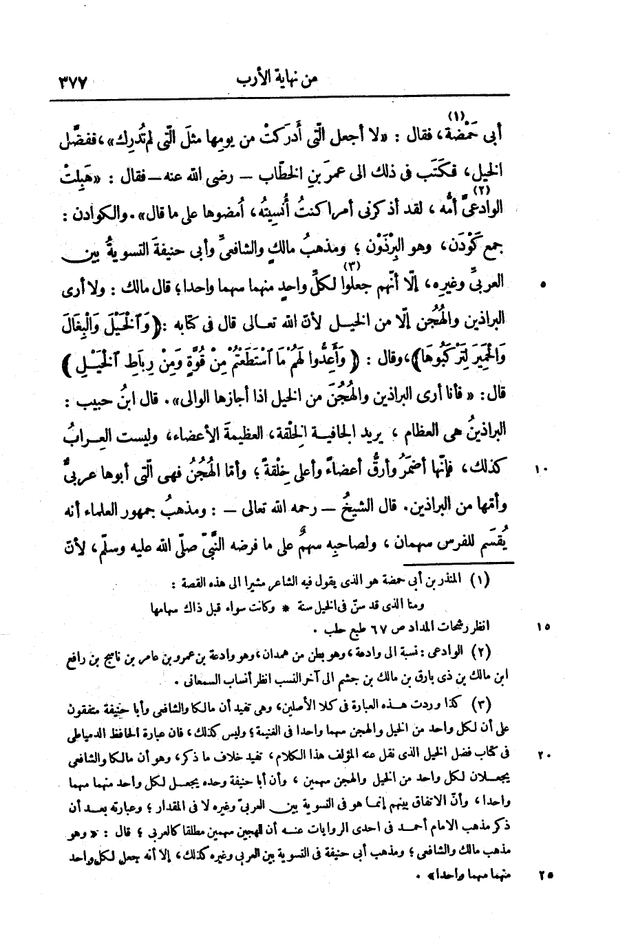 البراذين هى العظام، يريد الجافية الخلقة، العظيمة الأعضاء، وليست العراب كذلك، فإنّها أضمر وأرقّ أعضاء وأعلى خلقة؛ وأمّا الهجن فهى التى أبوها عربىّ وأمّها من البراذين. قال الشيخ- رحمه الله تعالى-: ومذهب جمهور العلماء أنه يقسم للفرس سهمان، ولصاحبه سهم على ما فرضه النّبىّ صلى الله عليه وسلم، لأنّ