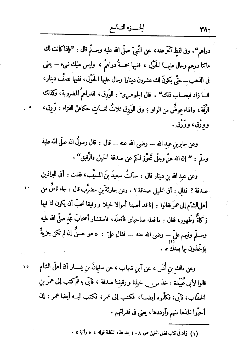 وعن جابر بن عبد الله- رضى الله عنه- قال: قال رسول الله صلى الله عليه وسلم: «إنّ الله عزّ وجلّ تجوّز لكم عن صدقة الخيل والرّقيق» .