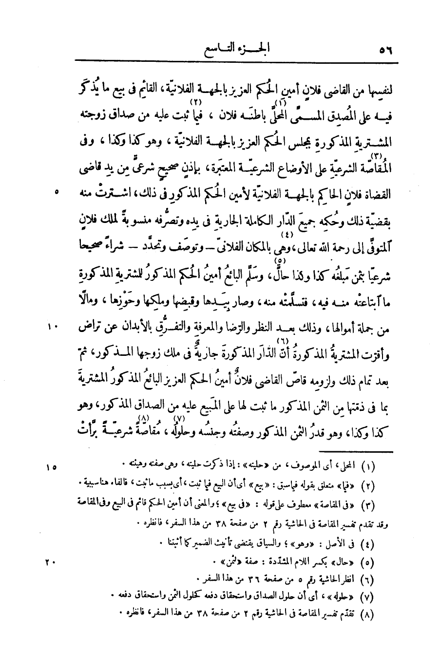لنفسها من القاضى فلان أمين الحكم العزيز بالجهة الفلانيّة، القائم فى بيع ما يذكر فيه على المصدق المسمّى المحلّى «1» باطنه فلان، فيما «2» ثبت عليه من صداق زوجته المشترية المذكورة بمجلس الحكم العزيز بالجهة الفلانيّة، وهو كذا وكذا، وفى المقاصّة «3» الشرعيّة على الأوضاع الشرعيّة المعتبرة، بإذن صحيح شرعىّ من يد قاضى القضاة فلان الحاكم بالجهة الفلانيّة لأمين الحكم المذكور فى ذلك، اشترت منه بقضيّة ذلك وحكمه جميع الدّار الكاملة الجارية فى يده وتصرّفه منسوبة لملك فلان المتوفّى إلى رحمة الله تعالى، وهى «4» بالمكان الفلانىّ- وتوصف وتحدّد- شراء صحيحا شرعيّا بثمن مبلغه كذا وكذا حالّ «5» ، وسلم البائع أمين الحكم المذكور للمشترية المذكورة ما ابتاعته منه فيه، فتسلّمته منه، وصار بيدها وقبضها وملكها وحوزها، ومالا من جملة أموالها، وذلك بعد النظر والرضا والمعرفة والتفرّق بالأبدان عن تراض وأقرّت المشترية المذكورة أنّ «6» الدّار المذكورة جارية فى ملك زوجها المذكور، ثمّ بعد تمام ذلك ولزومه قاصّ القاضى فلان أمين الحكم العزيز البائع المذكور المشترية بما فى ذمّتها من الثمن المذكور ما ثبت لها على المبيع عليه من الصداق المذكور، وهو كذا وكذا، وهو قدر الثمن المذكور وصفته وجنسه وحلوله «7» ، مقاصّة «8» شرعيّة برّأت