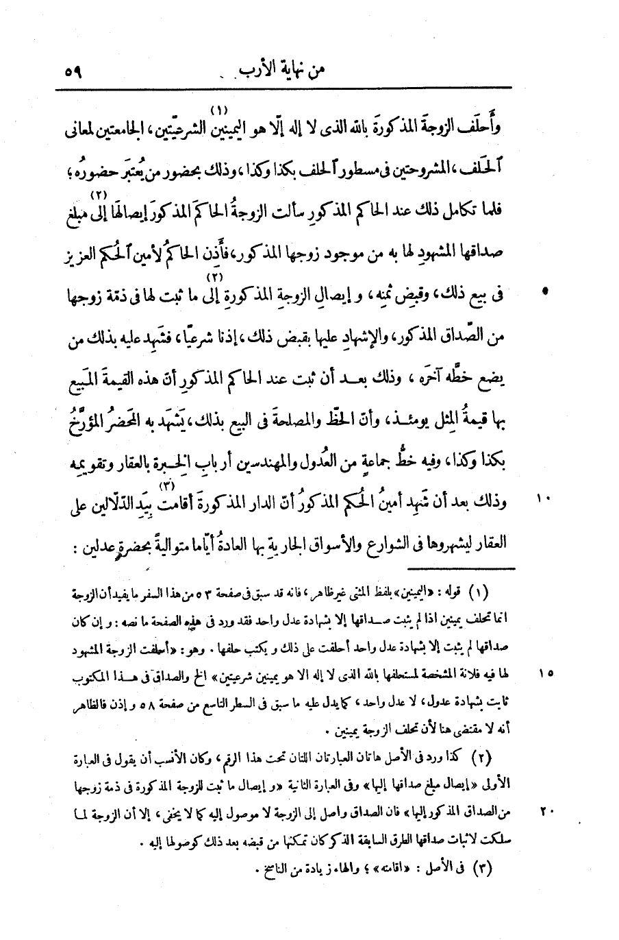 وأحلف الزوجة المذكورة بالله الذى لا إله إلّا هو اليمينين «1» الشرعيّتين، الجامعتين لمعانى الحلف، المشروحتين فى مسطور الحلف بكذا وكذا، وذلك بحضور من يعتبر حضوره؛ فلما تكامل ذلك عند الحاكم المذكور سألت الزوجة الحاكم المذكور إيصالها إلى «2» مبلغ صداقها المشهود لها به من موجود زوجها المذكور، فأذن الحاكم لأمين الحكم العزيز فى بيع ذلك، وقبض ثمنه، وإيصال الزوجة المذكورة إلى «3» ما ثبت لها فى ذمّة زوجها من الصّداق المذكور، والإشهاد عليها بقبض ذلك، إذنا شرعيّا، فشهد عليه بذلك من يضع خطّه آخره، وذلك بعد أن ثبت عند الحاكم المذكور أنّ هذه القيمة المبيع بها قيمة المثل يومئذ، وأنّ الحظّ والمصلحة فى البيع بذلك، يشهد به المحضر المؤرّخ بكذا وكذا، وفيه خطّ جماعة من العدول والمهندسين أرباب الخبرة بالعقار وتقويمه وذلك بعد أن شهد أمين الحكم المذكور أنّ الدار المذكورة أقامت «4» بيد الدلّالين على العقار ليشهروها فى الشوارع والأسواق الجارية بها العادة أيّاما متوالية بحضرة عدلين: