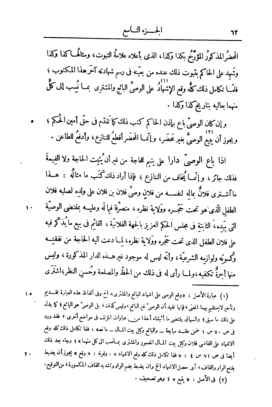 وإن كان الوصىّ باع بإذن الحاكم كتب ذلك كما تقدّم فى حقّ أمين الحكم؛ ويجوز أن يبيع «2» الوصىّ بغير محضر، وإنّما المحضر أقطع للتنازع، وأدفع للطاعن.