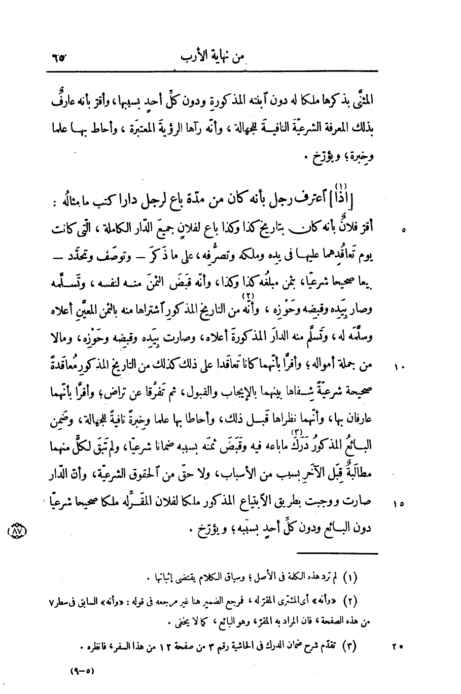 أقرّ فلان بأنه كان بتاريخ كذا وكذا باع لفلان جميع الدّار الكاملة، التى كانت يوم تعاقدهما عليها فى يده وملكه وتصرّفه، على ما ذكر- وتوصف وتحدّد- بيعا صحيحا شرعيّا، بثمن مبلغه كذا وكذا، وأنّه قبض الثمن منه لنفسه، وتسلّمه وصار بيده وقبضه وحوزه، وأنّه «2» من التاريخ المذكور اشتراها منه بالثمن المعيّن أعلاه وسلّمه له، وتسلّم منه الدار المذكورة أعلاه، وصارت بيده وقبضه وحوزه، ومالا من جملة أمواله؛ وأقرّا بأنّهما كانا تعاقدا على ذلك كذلك من التاريخ المذكور معاقدة صحيحة شرعيّة شفاها بينهما بالإيجاب والقبول، ثم تفرّقا عن تراض؛ وأقرّا بأنّهما عارفان بها، وأنّهما نظراها قبل ذلك، وأحاطا بها علما وخبرة نافية للجهالة، وضمن البائع المذكور درك «3» ما باعه فيه وقبض ثمنه بسببه ضمانا شرعيّا، ولم تبق لكلّ منهما مطالبة قبل الآخر بسبب من الأسباب، ولا حقّ من الحقوق الشرعيّة، وأنّ الدّار صارت ووجبت بطريق الابتياع المذكور ملكا لفلان المقرّ له ملكا صحيحا شرعيّا دون البائع ودون كلّ أحد بسببه؛ ويؤرّخ.