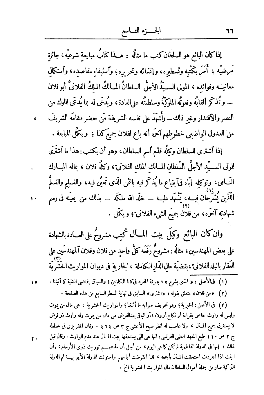 وهو أن يكتب: هذا ما اشترى للمولى السيّد الأجلّ السّلطان المالك الملك الفلانىّ، وكيله فلان، بماله المبارك النّامى، وتوكيله إيّاه فى ابتياع ما يذكر فيه بالثمن الذى تعيّن فيه، والتسليم والتسلّم اللّذين يشرحان «1» فيه، يشهد عليه- خلّد الله ملكه- بذلك من يعيّنه فى رسم شهادته آخره؛ من فلان «2» جميع الشىء الفلانىّ؛ ويكمّل.