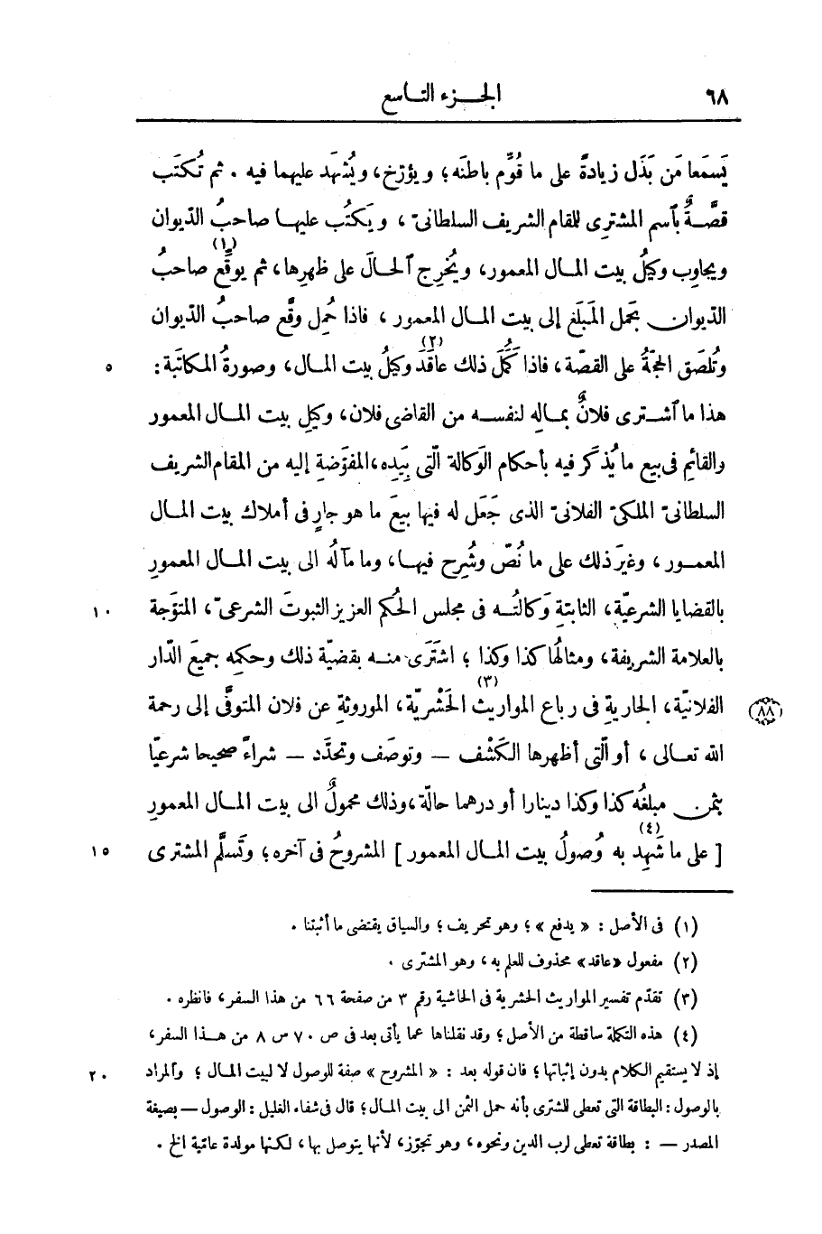 هذا ما اشترى فلان بماله لنفسه من القاضى فلان، وكيل بيت المال المعمور والقائم فى بيع ما يذكر فيه بأحكام الوكالة التى بيده، المفوّضة إليه من المقام الشريف السلطانىّ الملكىّ الفلانىّ الذى جعل له فيها بيع ما هو جار فى أملاك بيت المال المعمور، وغير ذلك على ما نصّ وشرح فيها، وما مآله الى بيت المال المعمور بالقضايا الشرعيّة، الثابتة وكالته فى مجلس الحكم العزيز الثبوت الشرعىّ، المتوّجة بالعلامة الشريفة، ومثالها كذا وكذا؛ اشترى منه بقضيّة ذلك وحكمه جميع الدّار الفلانيّة، الجارية فى رباع المواريث «3» الحشريّة، الموروثة عن فلان المتوفّى إلى رحمة الله تعالى، أو التى أظهرها الكشف- وتوصف وتحدّد- شراء صحيحا شرعيّا بثمن مبلغه كذا وكذا دينارا أو درهما حالّة، وذلك محمول الى بيت المال المعمور [على ما شهد «4» به وصول بيت المال المعمور] المشروح فى آخره؛ وتسلّم المشترى