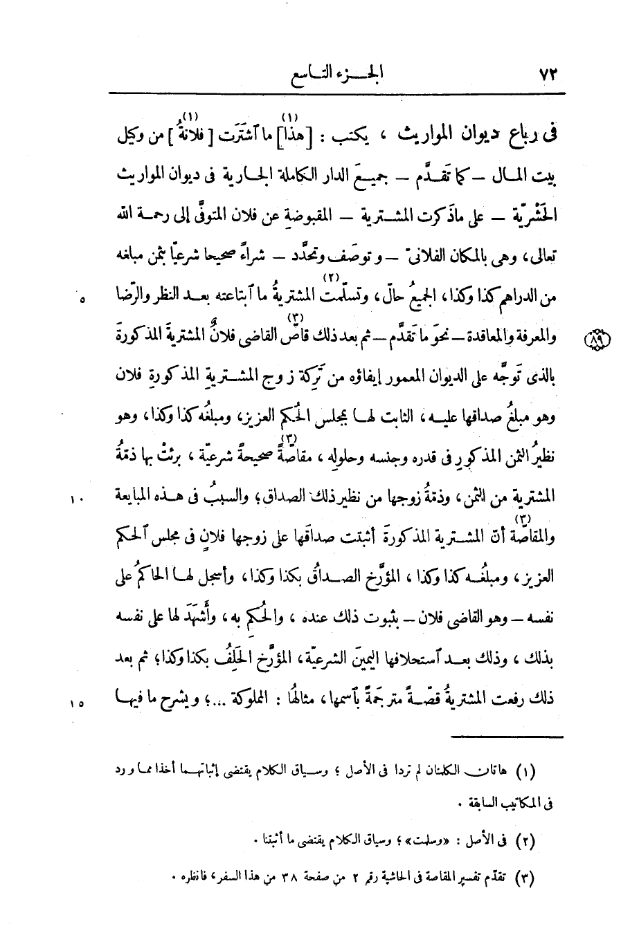 فى رباع ديوان المواريث، يكتب: [هذا «1» ] ما اشترت [فلانة «2» ] من وكيل بيت المال- كما تقدّم- جميع الدار الكاملة الجارية فى ديوان المواريث الحشريّة- على ما ذكرت المشترية- المقبوضة عن فلان المتوفّى إلى رحمة الله تعالى، وهى بالمكان الفلانىّ- وتوصف وتحدّد- شراء صحيحا شرعيّا بثمن مبلغه من الدراهم كذا وكذا، الجميع حالّ، وتسلّمت «3» المشترية ما ابتاعته بعد النظر والرّضا والمعرفة والمعاقدة- نحو ما تقدّم- ثم بعد ذلك قاصّ «4» القاضى فلان المشترية المذكورة بالذى توجّه على الديوان المعمور إيفاؤه من تركة زوج المشترية المذكورة فلان وهو مبلغ صداقها عليه، الثابت لها بمجلس الحكم العزيز، ومبلغه كذا وكذا، وهو نظير الثمن المذكور فى قدره وجنسه وحلوله، مقاصّة «5» صحيحة شرعيّة، برئت بها ذمّة المشترية من الثمن، وذمّة زوجها من نظير ذلك الصداق؛ والسبب فى هذه المبايعة والمقاصّة «6» أنّ المشترية المذكورة أثبتت صداقها على زوجها فلان فى مجلس الحكم العزيز، ومبلغه كذا وكذا، المؤرّخ الصداق بكذا وكذا، وأسجل لها الحاكم على نفسه- وهو القاضى فلان- بثبوت ذلك عنده، والحكم به، وأشهد لها على نفسه بذلك، وذلك بعد استحلافها اليمين الشرعيّة، المؤرّخ الحلف بكذا وكذا؛ ثم بعد ذلك رفعت المشترية قصّة مترجمة باسمها، مثالها: المملوكة ... ؛ ويشرح ما فيها