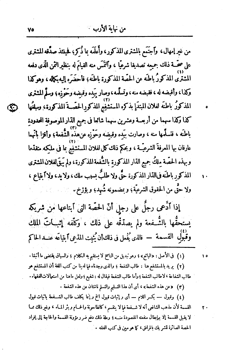 من غير إمهال، واجتمع بالمشترى المذكور، وأعلمه بما ذكر؛ فحينئذ صدّقه المشترى على صحّة ذلك جميعه تصديقا شرعيّا، والتمس منه القيام له بنظير الثمن الذى دفعه المشترى «1» المذكور باطنه عن الحصّة المذكورة باطنه؛ فأحضره إليه بكماله، وهو كذا وكذا، وأقبضه له، فقبضه منه، وتسلّمه، وصار بيده وقبضه وحوزه؛ وسلم المشترى المذكور باطنه لفلان المبتدإ بذكره المستشفع «2» المذكور الحصّة المذكورة، ومبلغها كذا وكذا سهما من أربعة وعشرين سهما شائعا فى جميع الدّار الموصوفة المحدودة باطنه، فتسلّمها منه، وصارت بيده وقبضه وحوزه عن هذه «3» الشفعة؛ وأقرّا بأنّهما عارفان بها المعرفة الشرعيّة، وبحكم ذلك كمل لفلان المستشفع «4» بما فى ملكه متقدّما وبهذه الحصّة ملك جميع الدّار المذكورة بالشّفعة المذكورة، ولم يبق لفلان المشترى المذكور باطنه فى الدّار المذكورة حقّ ولا طلب بسبب ملك، ولا يد، ولا ابتياع، ولا حقّ من الحقوق الشرعيّة؛ وبمضمونه شهد؛ ويؤرّخ.