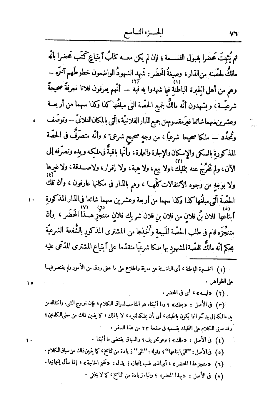 ثم يثبت محضرا بقبول القسمة؛ فإن لم يكن معه كتاب ابتياع كتب محضرا بأنّه مالك لحصّته من الدّار، وصيغة المحضر: شهد الشهود الواضعون خطوطهم آخره- وهم من أهل الخبرة الباطنة «1» فيما شهدوا به فيه «2» - أنّهم يعرفون فلانا معرفة صحيحة شرعيّة، ويشهدون أنّه مالك لجميع الحصّة التى مبلغها كذا وكذا سهما من أربعة وعشرين سهما شائعا غير مقسوم من جميع الدّار الفلانيّة، التى بالمكان الفلانىّ- وتوصف وتحدّد- ملكا صحيحا شرعيّا، من وجه صحيح شرعىّ، وأنّه متصرّف فى الحصّة المذكورة بالسكن والإسكان والإجارة والعمارة، وأنّها باقية فى ملكه ويده وتصرّفه إلى الآن، ولم تخرج عنه بتمليك «3» ، ولا بيع، ولا هبة، ولا إقرار، ولا صدقة، ولا غيرها ولا بوجه من وجوه الانتقالات كلّها، وهم بالدّار فى مكانها عارفون، وأنّ تلك «4» الحصّة التى مبلغها كذا وكذا سهما من أربعة وعشرين سهما شائعا فى الدّار المذكورة ابتاعها «5» فلان بن فلان من فلان بن فلان شريك فلان متنجّز «6» هذا «7» المحضر، وأنّ متنجّزه قام فى طلب الحصّة المبيعة وأخذها من المشترى المذكور بالشّفعة الشرعيّة بحكم أنّه مالك للحصّة المشهود بها ملكا شرعيّا متقدّما على ابتياع المشترى المدّعى عليه