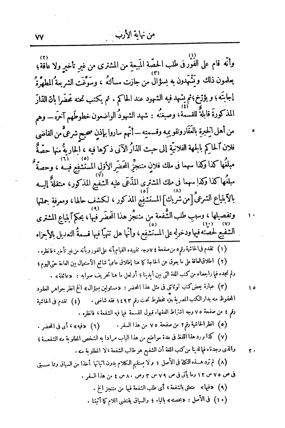 وأنّه قام على الفور «1» فى طلب الحصّة المبيعة من المشترى من غير تأخير ولا عاقة «2» ؛ يعلمون ذلك ويشهدون به بسؤال «3» من جازت مسألته، وسوّغت الشريعة المطهّرة إجابته؛ ويؤرّخ؛ ثم يشهد فيه الشهود عند الحاكم. ثمّ يكتب تحته محضرا بأنّ الدّار المذكورة قابلة للقسمة «4» ، وصيغته: شهد الشهود الواضعون خطوطهم آخره- وهم من أهل الخبرة بالعقار وتقويمه وقسمته- أنّهم ساروا بإذن صحيح شرعىّ من القاضى فلان الحاكم بالجهة الفلانيّة إلى حيث الدّار الآتى ذكرها فيه، الجارية منها حصّة مبلغها كذا وكذا سهما فى ملك فلان متنجّز المحضر الأوّل المستشفع «5» فيه «6» ، وحصّة مبلغها كذا وكذا سهما فى ملك المشترى المدّعى عليه الشفيع «7» المذكور، منتقلة إليه بالابتياع الشرعىّ [من شريك «8» ] المستشفع «9» المذكور، لكشف حالها، ومعرفة جملتها وتفصيلها، وسبب طلب الشّفعة من متنجّز هذا المحضر فيها «10» ، بحكم ابتياع المشترى الشفيع «11» لحصّته «12» فيها ودخوله على المستشفع «13» ، وأنّها هل تتهيّأ فيها قسمة التعديل بالأجزاء