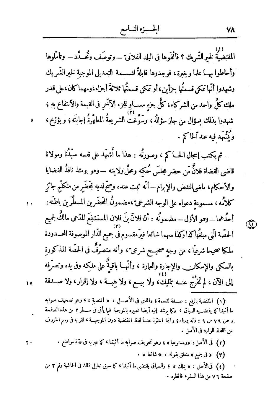 المقتضية «1» لخير الشّريك؟ فألفوها فى البلد الفلانىّ- وتوصف وتحدّد- وتأمّلوها وأحاطوا بها علما وخبرة، فوجدوها قابلة لقسمة التعديل الموجبة لخير الشّريك وشهدوا أنّها تمكن قسمتها جزأين، أو تمكن قسمتها ثلاثة أجزاء، ومهما كان، على قدر ملك كلّ واحد من الشركاء، كلّ جزء مساو للجزء الآخر فى القيمة والانتفاع به؛ شهدوا بذلك بسؤال من جاز سؤاله، وسوّغت «2» الشريعة المطهّرة إجابته؛ ويؤرّخ، ويشهد فيه عند الحاكم.