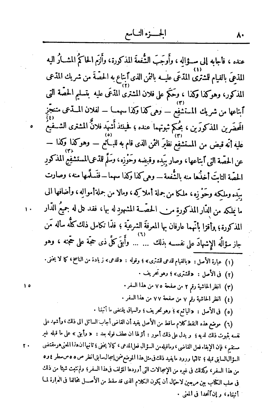 عنده، فأجابه إلى سؤاله، وأوجب الشّفعة المذكورة، وألزم الحاكم المشار اليه المدّعى بالقيام للمشترى «1» المدّعى عليه بالثمن الذى ابتاع به الحصّة من شريك المدّعى المذكور، وهو كذا وكذا، وحكم على فلان المشترى «2» المدّعى عليه بتسليم الحصّة التى ابتاعها من شريك المستشفع «3» - وهى كذا وكذا سهما- لفلان المدّعى متنجّز المحضرين المذكورين، بحكم ثبوتهما عنده؛ فحينئذ أشهد فلان المشترى الشفيع «4» عليه أنّه قبض من المستشفع «5» نظير الثمن الذى قام به للبائع «6» - وهو كذا وكذا- عن الحصّة التى ابتاعها، وصار بيده وقبضه وحوزه، وسلم للمدّعى المستشفع «7» المذكور الحصّة الثابت أخذها منه بالشّفعة- وهى كذا وكذا سهما- فتسلّمها منه، وصارت بيده وملكه وحوزه، ملكا من جملة أملاكه، ومالا من جملة أمواله، وأضافها الى ما يملكه من الدّار المذكورة من الحصّة المشهود له بها، فقد كمل له جميع الدّار المذكورة؛ وأقرّا بأنّهما عارفان بها المعرفة الشرعيّة؛ فلمّا تكامل ذلك كلّه سأله من جاز سؤاله الإشهاد على نفسه بذلك ... «8» ... وأبقى كلّ ذى حجّة على حجّته، وهو