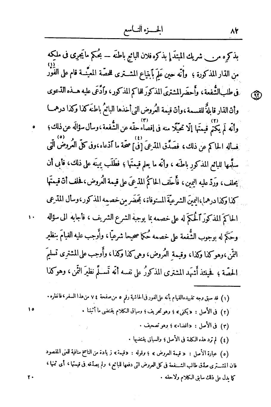 بذكره من شريك المبتدإ بذكره فلان البائع باطنه- بحكم ما يجرى فى ملكه من الدّار المذكورة؛ وأنّه حين علم بابتياع المشترى للحصّة المعيّنة قام على الفور «1» فى طلب الشّفعة، وأحضر المشترى المذكور للحاكم المذكور، وادّعى عليه هذه الدّعوى وأنّ الدّار قابلة للقسمة، وأنّ قيمة العروض التى أخذها البائع باطنه كذا وكذا درهما وأنّه لم يكتم «2» قيمتها إلّا تحيّلا منه فى إقصاء «3» حقّه عن الشّفعة، وسأل سؤاله عن ذلك؛ فسأله الحاكم عن ذلك، فصدّق المدّعى [فى] «4» صحّة ما ادّعاه، وفى كلّ العروض «5» التى سلّمها للبائع المذكور باطنه، وأنّه ما يعلم قيمتها؛ فطلب يمينه على ذلك، فأبى أن يحلف، وردّ عليه اليمين، فأحلف الحاكم المدّعى على قيمة العروض، فحلف أنّ قيمتها كذا وكذا درهما، اليمين الشرعيّة المستوفاة، بمحضر من خصمه المذكور، وسأل المدّعى الحاكم المذكور الحكم له على خصمه بما يوجبه الشرع الشريف، فأجابه الى سؤاله وحكم له بوجوب الشّفعة على خصمه حكما صحيحا شرعيّا، وأوجب عليه القيام بنظير الثّمن، وهو كذا وكذا، وقيمة العروض، وهى كذا وكذا، وأوجب على المشترى تسليم الحصّة؛ فحينئذ أشهد المشترى المذكور على نفسه أنّه تسلّم نظير الثّمن، وهو كذا