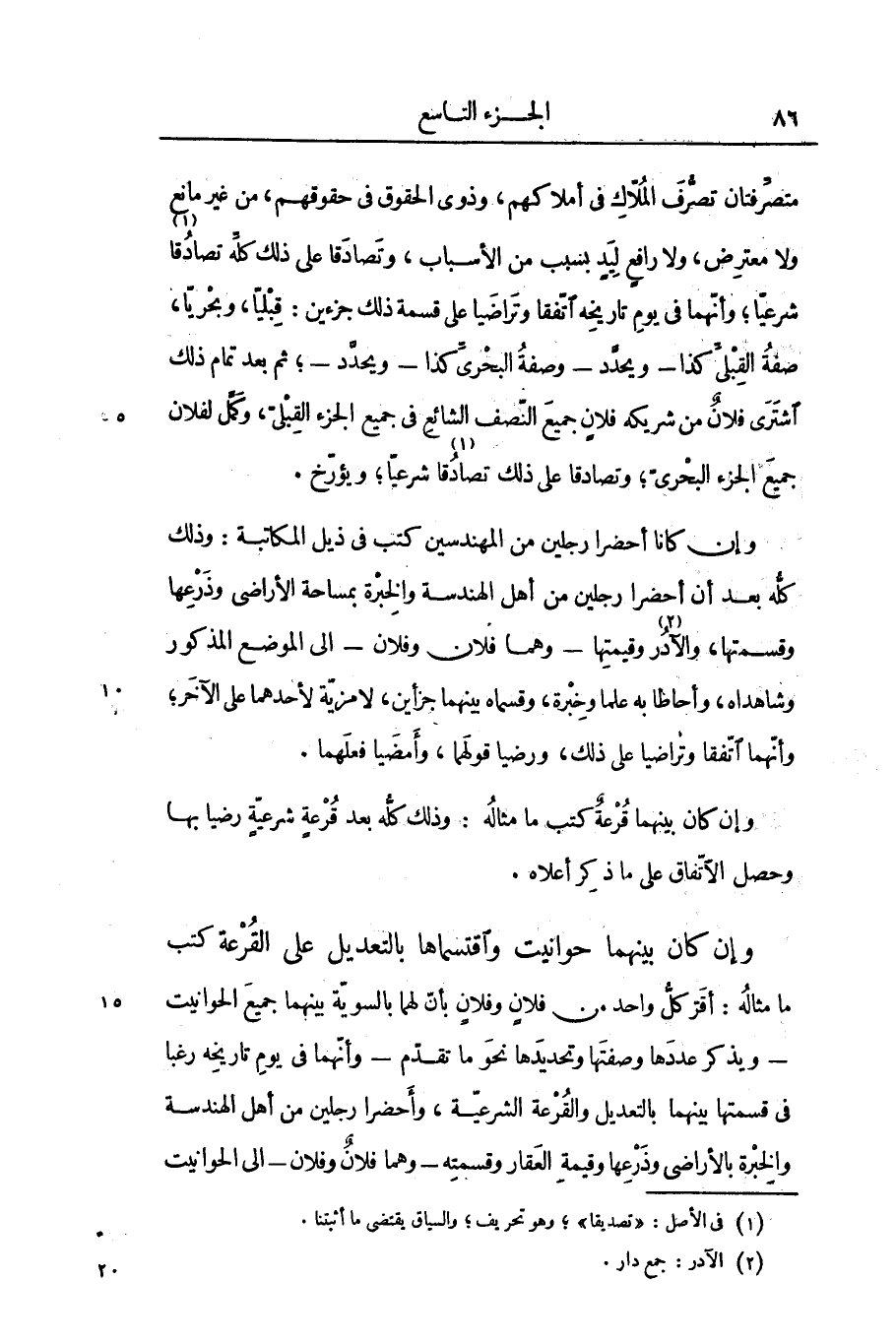 وإن كانا أحضرا رجلين من المهندسين كتب فى ذيل المكاتبة: وذلك كلّه بعد أن أحضرا رجلين من أهل الهندسة والخبرة بمساحة الأراضى وذرعها وقسمتها، والآدر «3» وقيمتها- وهما فلان وفلان- الى الموضع المذكور وشاهداه، وأحاطا به علما وخبرة، وقسماه بينهما جزأين، لا مزيّة لأحدهما على الآخر؛ وأنّهما اتّفقا وتراضيا على ذلك، ورضيا قولهما، وأمضيا فعلهما.