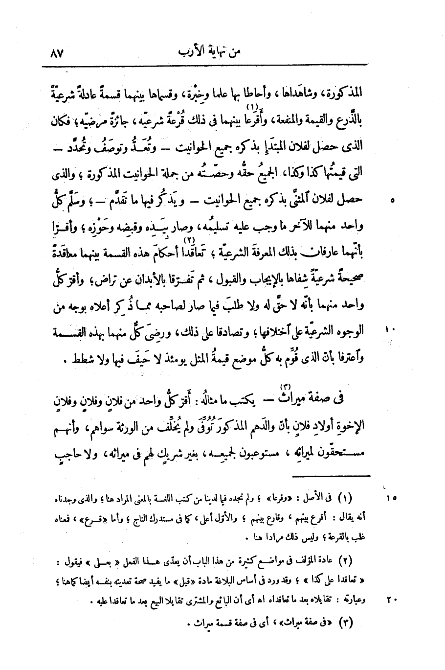 فى صفة ميراث «3» - يكتب ما مثاله: أقرّ كلّ واحد من فلان وفلان وفلان الإخوة أولاد فلان بأنّ والدهم المذكور توفّى ولم يخلّف من الورثة سواهم، وأنهم مستحقّون لميراثه، مستوعبون لجميعه، بغير شريك لهم فى ميراثه، ولا حاجب