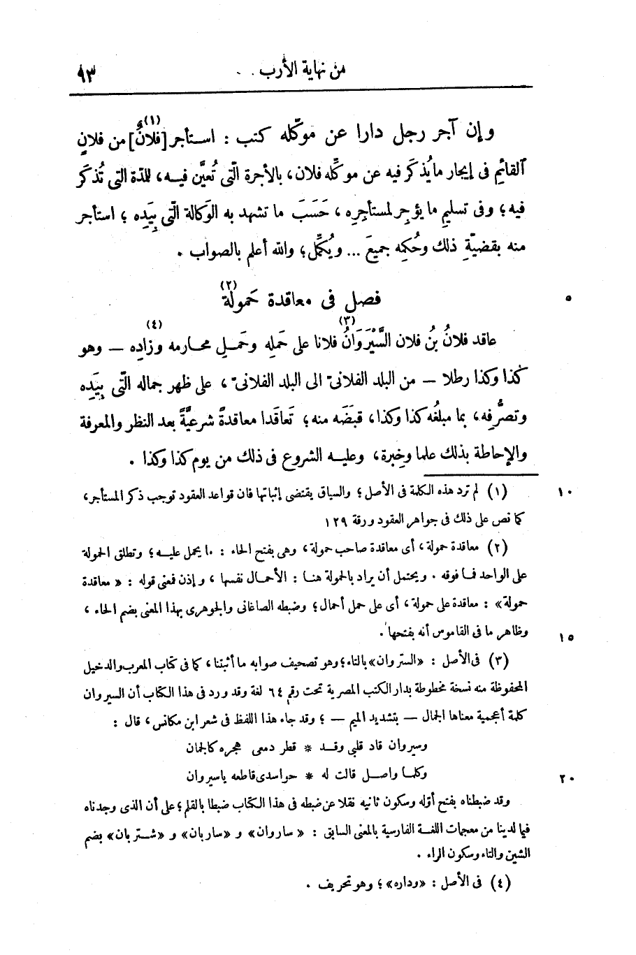 عاقد فلان بن فلان السّيروان «3» فلانا على حمله وحمل محارمه وزاده «4» - وهو كذا وكذا رطلا- من البلد الفلانىّ الى البلد الفلانىّ، على ظهر جماله التى بيده وتصرّفه، بما مبلغه كذا وكذا، قبضه منه؛ تعاقدا معاقدة شرعيّة بعد النظر والمعرفة والإحاطة بذلك علما وخبرة، وعليه الشروع فى ذلك من يوم كذا وكذا.