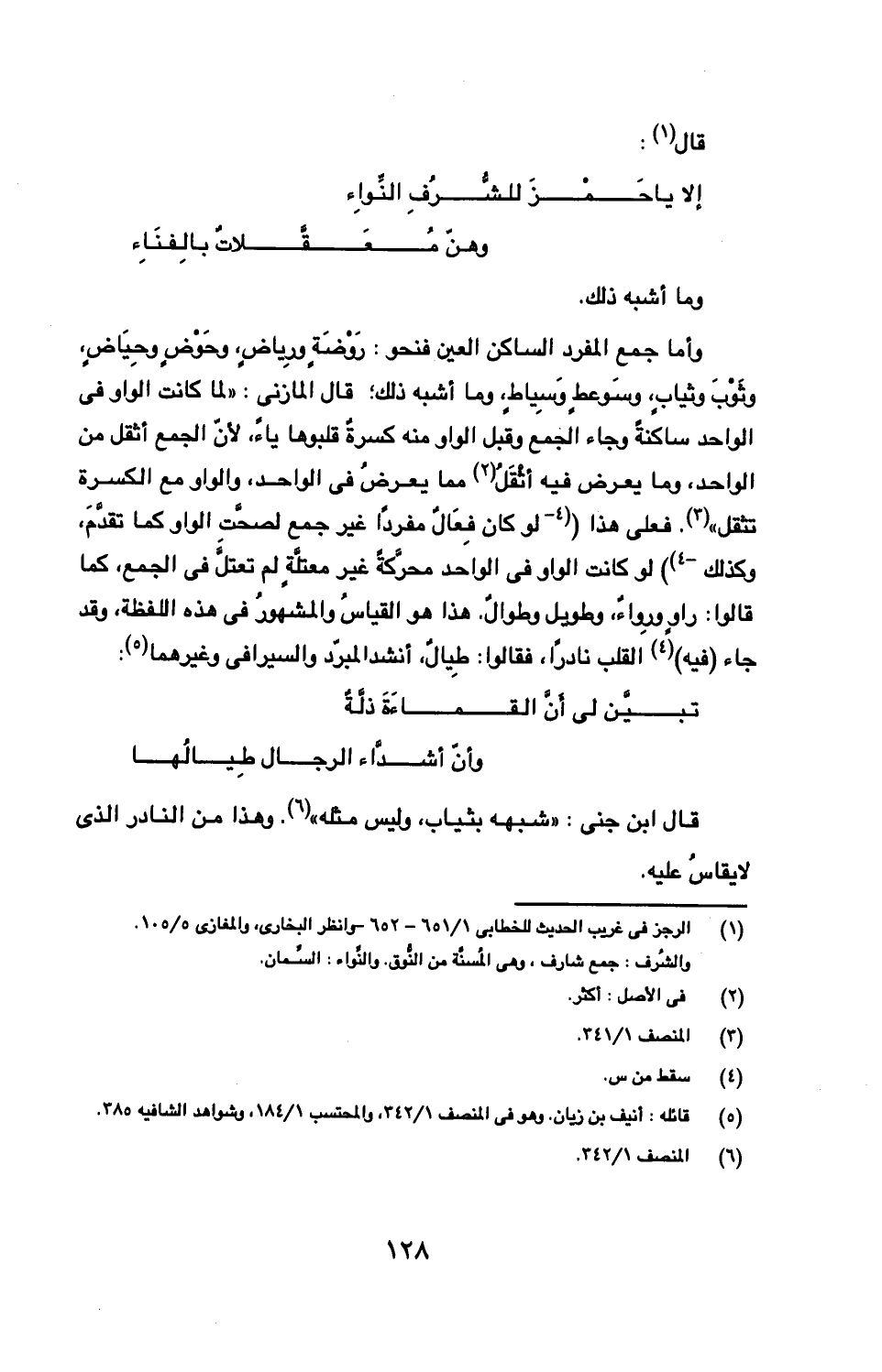 وأما جمع المفرد الساكن العين فنحو: روضة ورياض، وحوض وحياض، وثوب وثياب، وسوعط وسياط، وما أشبه ذلك؛ قال المازني: "لما كانت الواو في الواحد ساكنة وجاء الجمع وقبل الواو منه كسرة قلبوها ياء، لأن الجمع أثقل من الواحد، وما يعرض فيه أثقل مما يعرض في الواحد، والواو مع الكسرة تثقل". فعلى هذا (لو كان فعال مفردا غير جمع لصحت الواو كما تقدم، وكذلك) لو كانت الواو في الواحد محركة غير معتلة لم تعتل في الجمع، كما قالوا: راو ورواء، وطويل وطوال. هذا هو القياس والمشهور في هذه اللفظة، وقد جاء (فيه) القلب نادرا، فقالوا: طيال، أنشد المبرد والسيرافي وغيرهما: