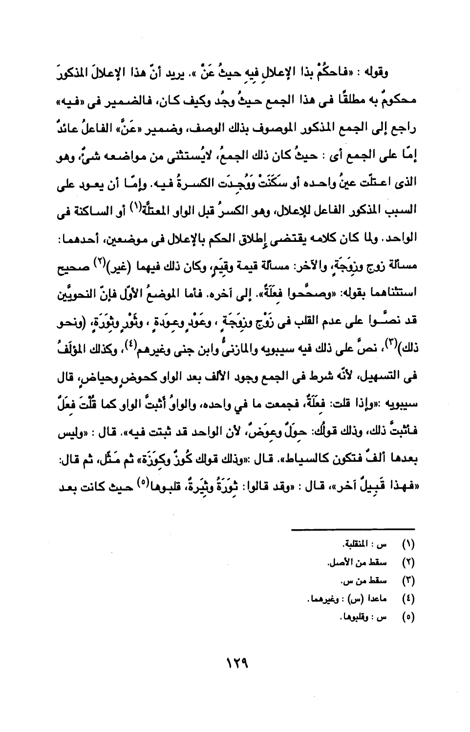 وقوله: "فاحكم بذا الإعلال فيه حيث عن". يريد أن هذا الإعلال المذكور محكوم به مطلقا في هذا الجمع حيث وجد وكيف كان، فالضمير في "فيه"راجع إلى الجمع المذكور الموصوف بذلك الوصف، وضمير "عن" الفاعل عائد إما على الجمع أي: حيث كان ذلك الجمع، لا يستثنى من مواضعه شيء، وهو الذي اعتلت عين واحدة أو سكنت ووجدت الكسرة فيه. وإما أن يعود على السبب المذكور الفاعل للإعلال، وهو الكسر قبل الواو المعتلة أو الساكنة في الواحد. ولما كان كلامه يقتضي إطلاق الحكم بالإعلال في موضعين، أحدهما: مسألة زوج وزوجة، والآخر: مسألة قيمة وقيم، وكان ذلك فيهما (غير) صحيح استثناهما بقله: "وصححوا فعلة". إلى آخره. فأما الموضع الأول فإن النحويين قد نصوا على عدم القلب في زوج وزوجة، وعود وعودة، وثور وثورة، (ونحو ذلك)، نص على لذلك فيه سيبويه والمازني وابن جني وغيرهم، وكذلك المؤلف في التسهيل، لأنه شرط في الجمع وجود الألف بعد الواو كحوض وحياض، قال سيبويه: "وإذا قلت: فعلة، فجمعت ما في واحده، والواو أثبت الواو كما قلت فعل فأثبت ذلك، وذلك قولك: حول وعوض، لأن الواحد قد ثبتت فيه". قال: "وليس بعدها ألف فتكون كالسياط". قال: "وذلك قولك كوز وكوزة" ثم مثل، ثم قال: "فهذا قبيل آخر"، قال: "وقد قالوا: ثورة وثيرة، قلبوها حيث كانت بعد
