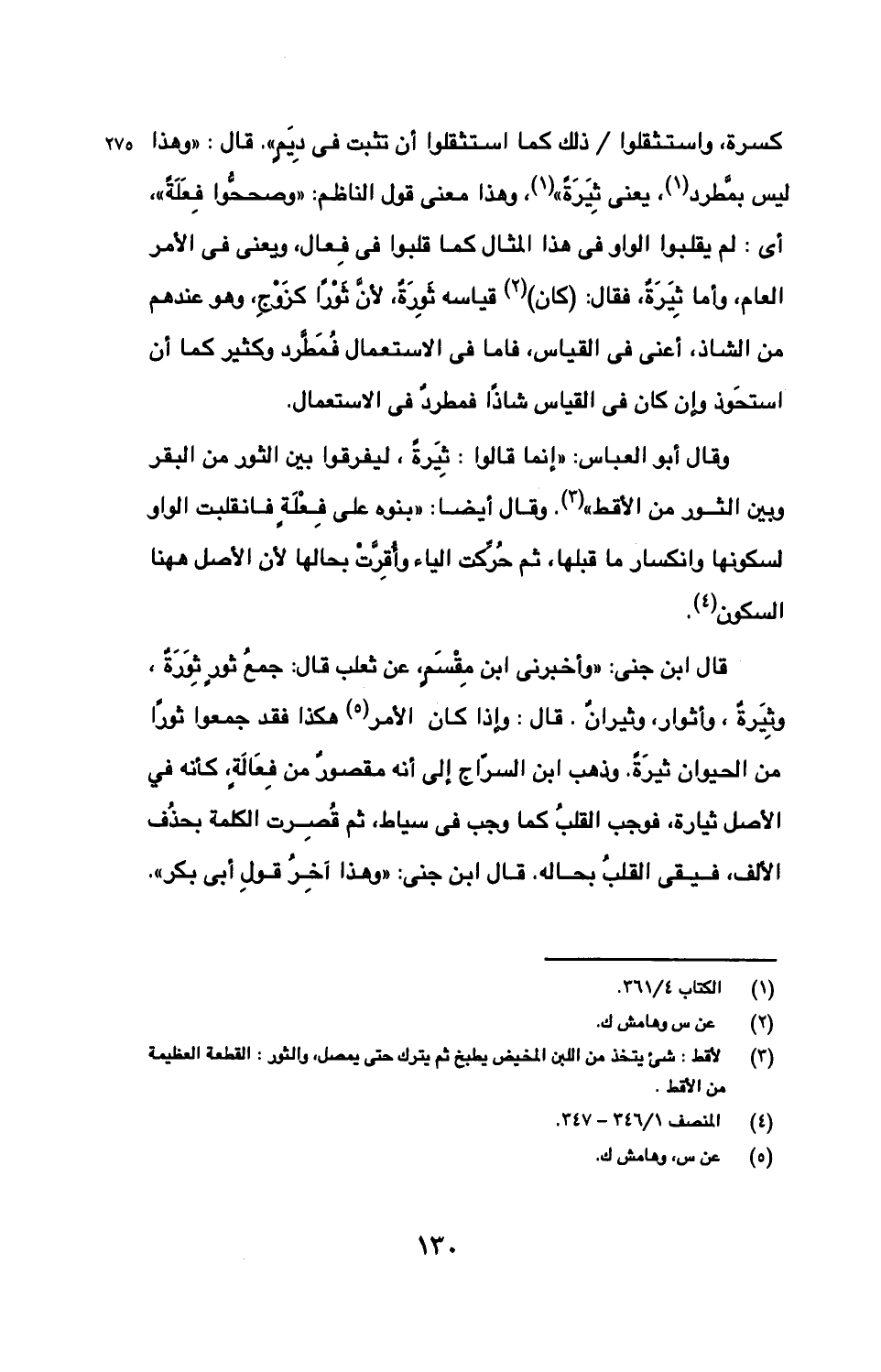 وقال أبو العباس: "إنما قالوا: ثيرة، ليفرقوا بين الثور من البقر وبين الثور من الأقط". وقال أيضا: "بنوه على فعلة فانقلبت الواو لسكونها وانكسار ما قبلها، ثم حركت الياء وأقرت بحالها لأن الأصل ههنا السكون.