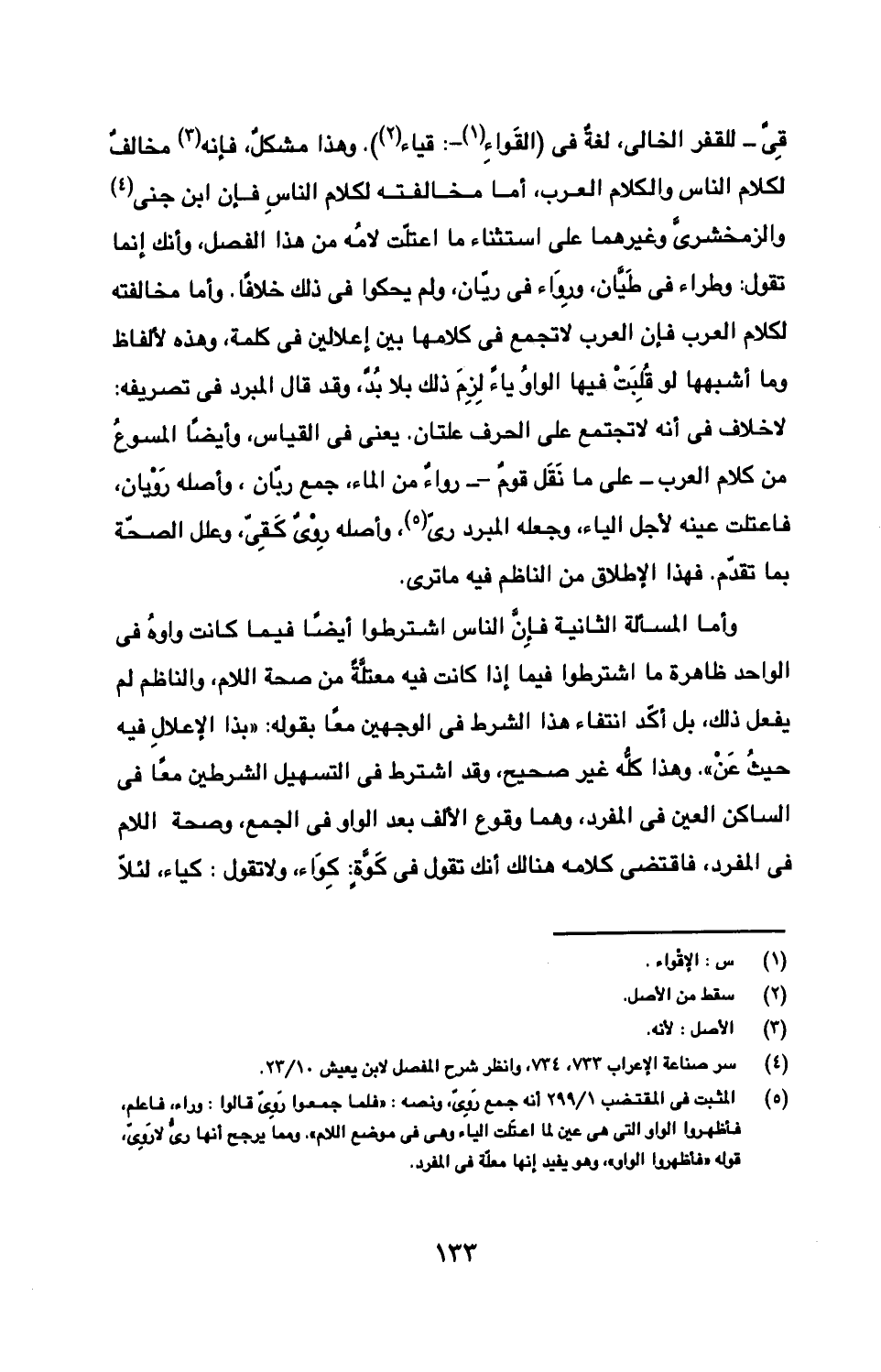 قي- للقفر الخالي، لغة في (القواء-: قياء). وهذا مشكل، فإنه مخالف لكلام الناس والكلام والعرب، أما مخالفته لكلام الناس فإن ابن جني والزمخشري وغيرهما على استثناء ما اعتلت لامه من هذا الفصل، وأنك إنما تقول: وطراء في طيان، ورواء في ريان، ولم يحكوا في ذلك خلافا. وأما مخالفته لكلام العرب فإن العرب لا تجمع في كلامها بين إعلالين في كلمة، وهذه الألفاظ وما أشبهها لو قلبت فيها الواو ياء لزم ذلك بلا بد، وقد قال المبرد في تصريفه: لا خلاف في أنه لا تجتمع على الحرف علتان. يعني في القياس، وأيضا المسوع من كلام العرب- على ما نقل قوم- رواء من الماء، جمع ربان، وأصله رويان، فاعتلت عينه لأجل الياء، وجعله المبرد ري، وأصله روى كقي، وعلل الصحة بما تقدم. فهذا الإطلاق من الناظم فيه ما ترى.