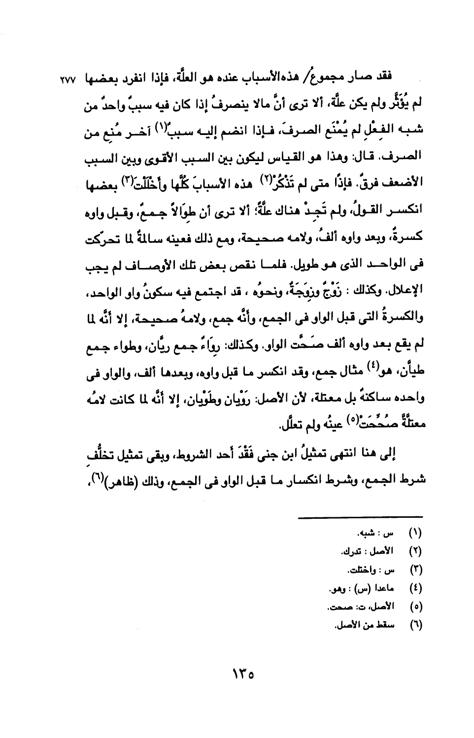 إلى هنا انتهى تمثيل ابن جني فقد أحد الشروط، وبقى تمثيل تخلف شرط الجمع، وشرط انكسار ما قبل الواو في الجمع، وذلك (ظاهر)،