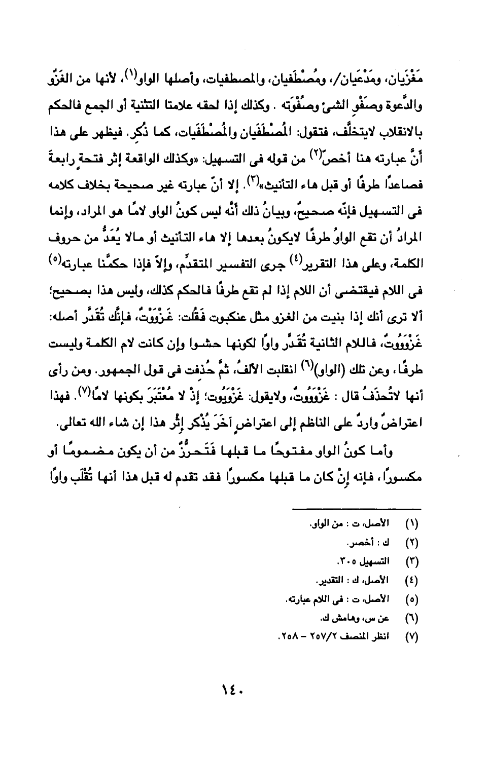 مغزيان، ومدعيان/، ومصطفيان، والمصطفيات، وأصلها الواو، لأنها من الغزو والدعوة وصفو الشيء وصفوته. وكذلك إذا لحقه علامتا التثنية أو الجمع فالحكم بالانقلاب لا يتخلف، فتقول: المصطفيان والمصطفيات، كما ذكر. فيظهر على هذا أن عبارته هنا أخص من قوله في التسهيل: "وكذلك الواقعة إثر فتحة رابعة فصاعدا طرفا أو قبل هاء التأنيث". إلا أن عبارته غير صحيحة بخلاف كلامه في التسهيل فإنه صحيح، وبيان ذلك أنه ليس كون الواو لاما هو المراد، وإنما المراد أن تقع الواو طرفا لا يكون بعدها إلا هاء التأنيث أو مالا يعد من حروف الكلمة، وعلى هذا التقرير جرى التفسير المتقدم، وإلا فإذا حكمنا عبارته في اللام فيقتضي أن اللام إذا لم تقع طرفا فالحكم كذلك، وليس هذا بصحيح؛ ألا ترى أنك إذا بنيت من الغزو مثل عنكبوت فقلت: غزووت، فإنك تقدر أصله: غزوووت، فاللام الثانية تقدر واوا لكونها حشوا وإن كانت لام الكلمة وليست طرفا، وعن تلك (الواو) انقلبت الألف، ثم حذفت في قول الجمهور، ومن رأى أنها لا تحذف قال: غزوووت، ولا يقول: غزويوت؛ إذ لا معتبر بكونها لاما. فهذا اعتراض وارد على الناظم إلى اعتراض آخر يذكر إثر هذا إن شاء الله تعالى.