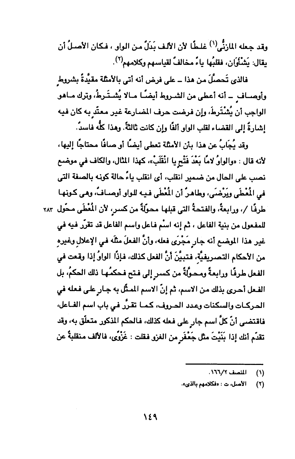 فالذي تحصل من هذا- على فرض أنه أتى بالأمثلة مقيدة بشروط وأوصاف- أنه أعطى من الشروط أيضا ما لا يشترط، وترك ما هو الواجب أن يشترط، وإن فرضت حرف المضارعة غير معتد به كان فيه إشارة إلى القضاء لقلب الواو ألفا وإن كانت ثالثة. وهذا كله فاسد.