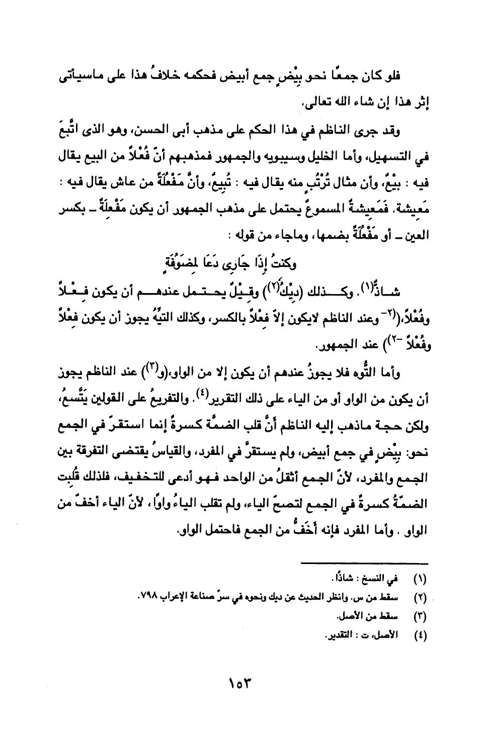 وقد جرى الناظم في هذا الحكم على مذهب أبي الحسن، وهو الذي اتبع في التسهيل، وأما الخليل وسيبويه والجمهور فمذهبهم أن فعلا من البيع يقال فيه: بيع، وأن مثال ترتب منه يقال فيه: تبيع، وأن مفعلة من عاش يقال فيه: معيشة. فمعيشة المسموع يحتمل على مذهب الجمهور أن يكون مفعلة- بكسر العين- أو مفعلة بضمها، وما جاء من قوله: