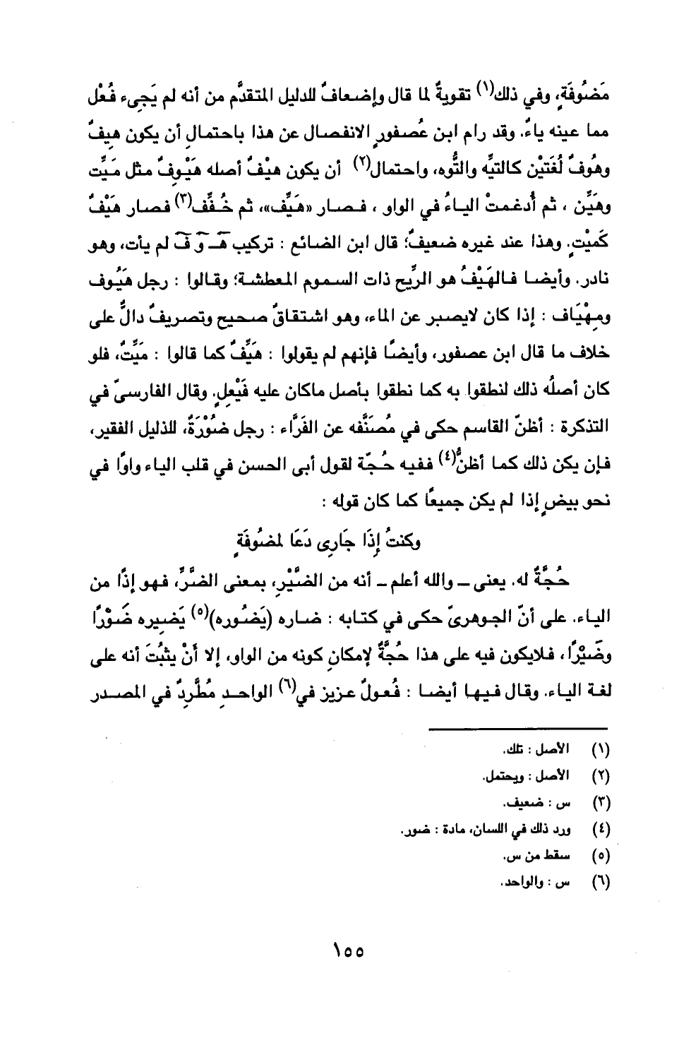 مضوفة، وفي ذلك تقوية لما قال وإضعاف للدليل المتقدم من أنه لم يجيء فعل مما عينه ياء. وقد رام ابن عصفور الانفصال عن هذا باحتمال أن يكون هيف وهوف لغتين كالتيه والتوه، واحتمال أن يكون هيف أصله هيوف مثل ميت وهين، ثم أدغمت الياء في الواو، فصار "هيف"، ثم خفف فصار هيف كميت. وهذا عند غيره ضعيف؛ قال ابن الضائع: تركيب هـ وف لم يأت، وهو نادر. وأيضا فالهيف هو الريح ذات السموم المعطشة؛ وقالوا: رجل هيوف ومهياف: إذا كان لا يصبر عن الماء، وهو اشتقاق صحيح وتصريف دال على خلاف ما قال ابن عصفور، وأيضا فإنهم لم يقولوا: هيف كما قالوا: ميت، فلو كان أصله ذلك لنطقوا به كما نطقوا بأصل ما كان عليه فيعل، وقال الفارسي في التذكرة: أظن القاسم حكى في مصنفه عن الفراء: رجل ضورة، للذليل الفقير، فإن يكن ذلك كما أظن ففيه حجة لقول أبي الحسن في قلب الياء واوا في نحو بيض إذا لم يكن جميعا كما كان قوله: