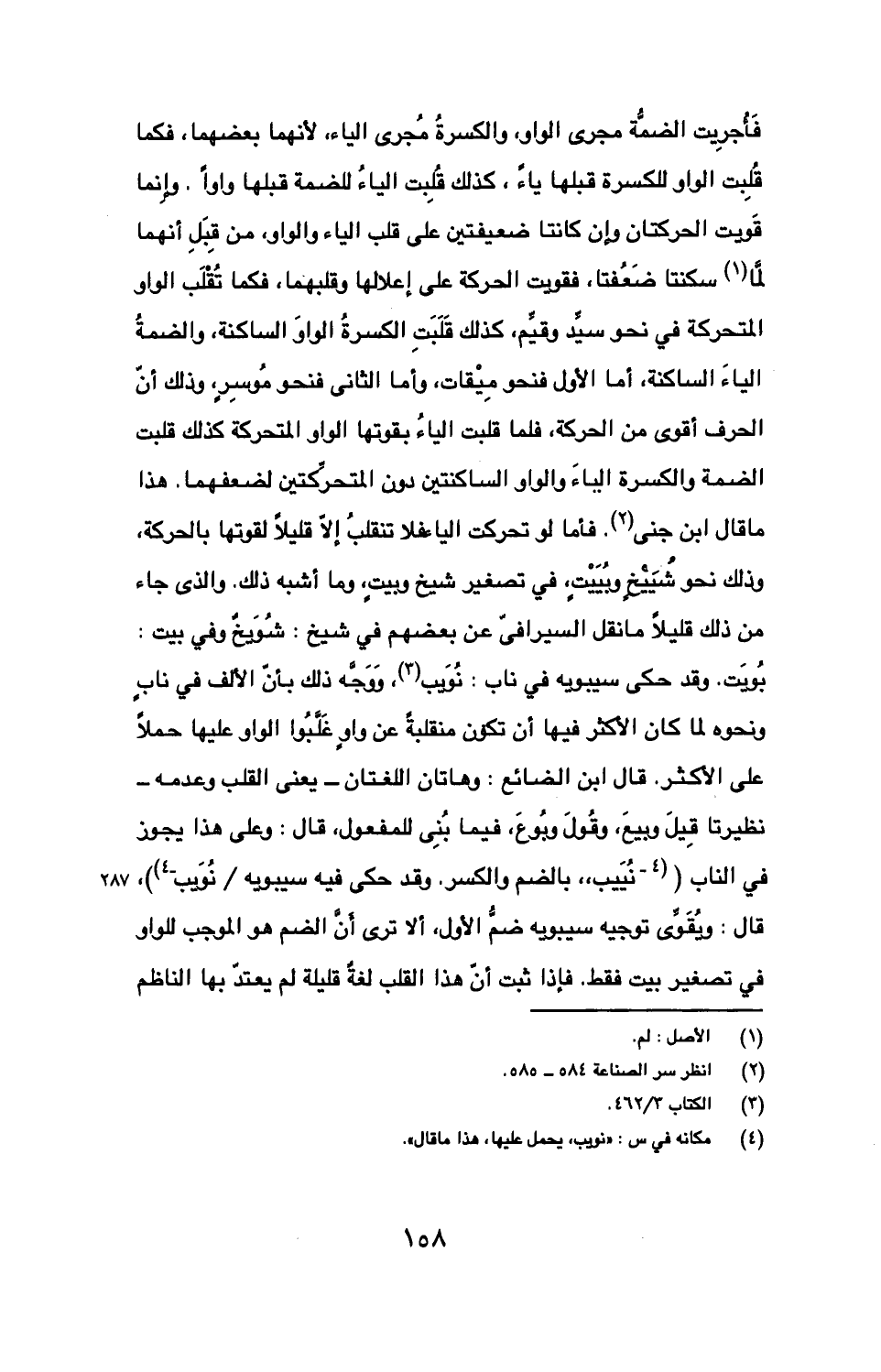 فأجريت الضمة مجرى الواو، والكسرة مجرى الياء، لأنهما بعضهما، فكما قلبت الواو للكسرة قبلها ياء، كذلك قلبت الياء للضمة قبلها واوا. وإنما قويت الحركتان وإن كانتا ضعيفتين على قلب الياء والواو، من قبل أنهما لما سكنتا ضعفتا، فقويت الحركة على إعلالها وقلبهما، فكما تقلب الواو المتحركة في نحو سيد وقيم، كذلك قلبت الكسرة الواو الساكنة، والضمة الياء الساكنة، أما الأول فنحو ميقات، وأما الثاني فنحو موسر، وذلك أن الحرف أقوى من الحركة، فلما قلبت الياء بقوتها الواو المتحركة كذلك قلبت الضمة والكسرة والياء الواو الساكنتين دون المتحركتين لضعفهما. هذا ما قال ابن جني. فأما لو تحركت الياء فلا تنقلب إلا قليلا لقوتها بالحركة، وذلك نحو شييخ وبييت، في تصغير شيخ وبيت، وما أشبه ذلك. والذي جاء من ذلك قليلا ما نقل السيرافي عن بعضهم في شيخ: شويخ وفي بيت: بويت. وقد حكى سيبويه في ناب: نويب، ووجه ذلك بأن الألف في ناب ونحوه لما كان الأكثر فيها أن تكون منقلبة عن واو غلبوا الواو عليها حملا على الأكثر. قال ابن الضائع: وهاتان اللغتان- يعني القلب وعدمه- نظيرتا قيل وبيع، وقول وبوع، فيما بني للمفعول، قال: وعلى هذا يجوز في الناب (نييب، بالضم والكسر، وقد حكي فيه سيبويه/ نويب)، قال: ويقوي توجيه سيبويه ضم الأول، ألا ترى أن الضم هو الموجب للواو في تصغير بيت فقط. فإذا ثبت أن هذا القلب لغة قليلة لم يعتد بها الناظم