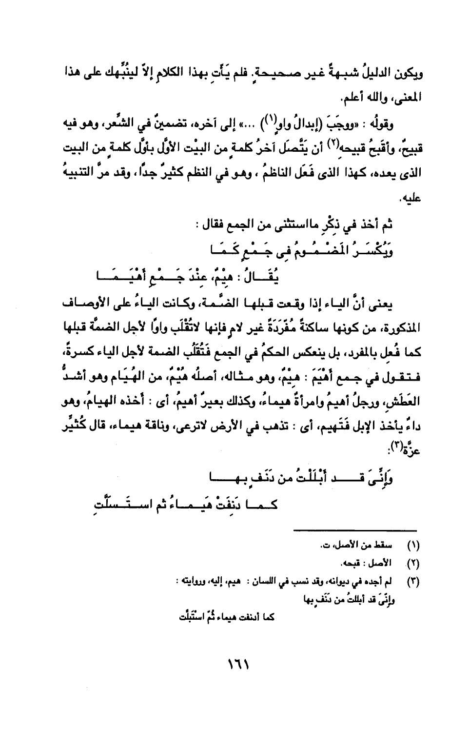 يعني أن الياء إذا وقعت قبلها الضمة، وكانت الياء على الأوصاف المذكورة، من كونها ساكنة مفردة غير لام فإنها لا تقلب واوا لأجل الضمة قبلها كما فعل بالمفرد، بل ينعكس الحكم في الجمع فتقلب الضمة لأجل الياء كسرة، فتقول في جمع أهيم: هيم، وهو مثاله، أصله هيم، من الهيام وهو أشد العطش، ورجل أهيم وامرأة هيماء، وكذلك بعير أهيم، أي: أخذه الهيام، وهو داء يأخذ الإبل فتهيم، أي: تذهب في الأرض لا ترعى، وناقة هيماء، قال كثير عزة: