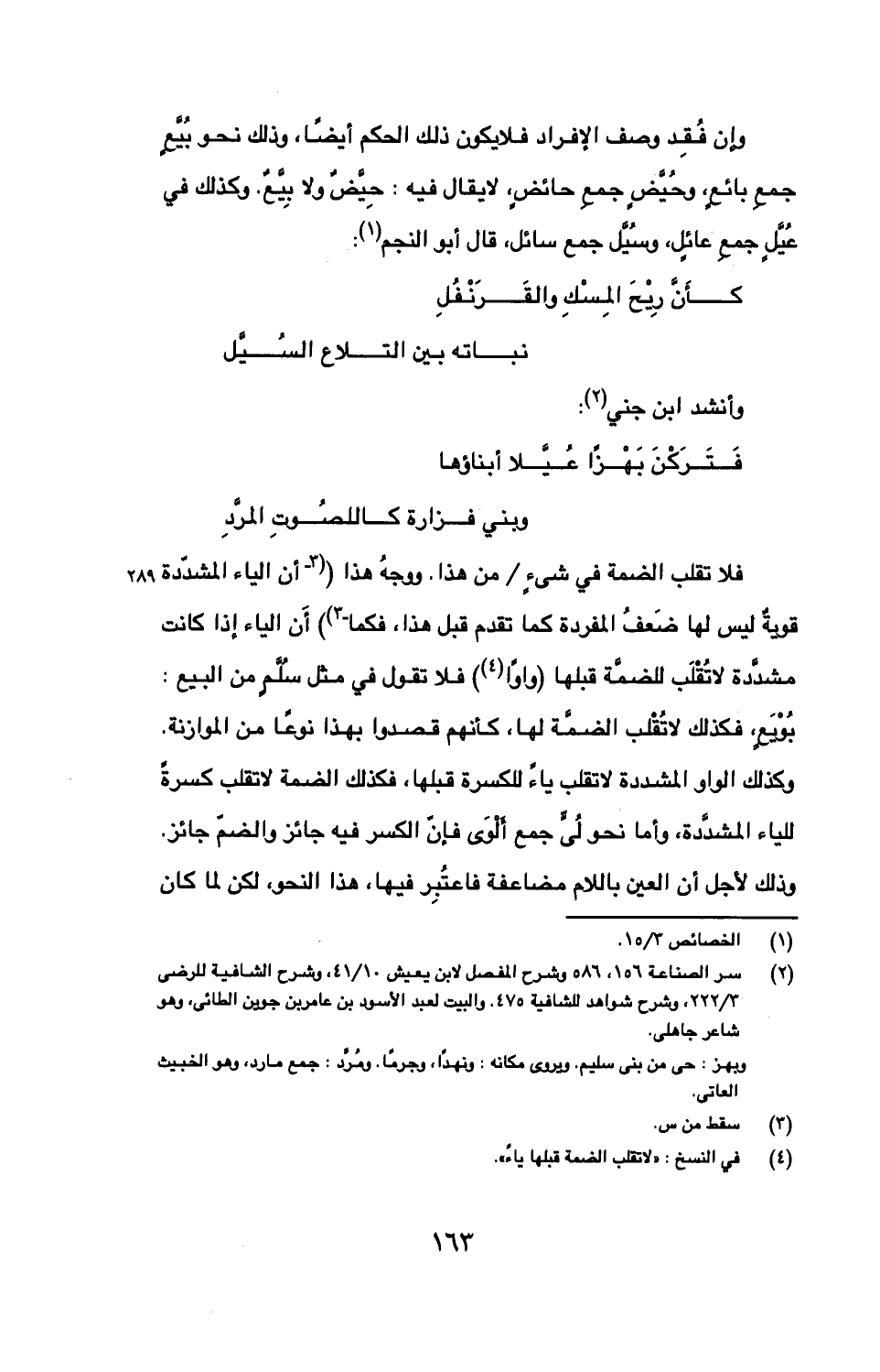 فلا تقلب الضمة في شيء/ من هذا. ووجه هذا (أن الياء المشددة قوية ليس لها ضعف المفردة كما تقدم قبل هذا، فكما) أن الياء إذا كانت مشددة لا تقلب للضمة قبلها (واوا) فلا تقول في مثل سلم من البيع: بويع، فكذلك لا تقلب الضمة لها، كانهم قصدوا بهذا نوعا من الموازنة. وكذلك الواو المشددة لا تقلب ياء للكسرة قبلها، فكذلك الضمة لا تقلب كسرة للياء المشددة، وأما نحو لي جمع ألوى فإن فيه جائز والضم جائز وذلك لأجل أن العين باللام مضاعفة فاعتبر فيها، هذا النحو، لكن لما كان