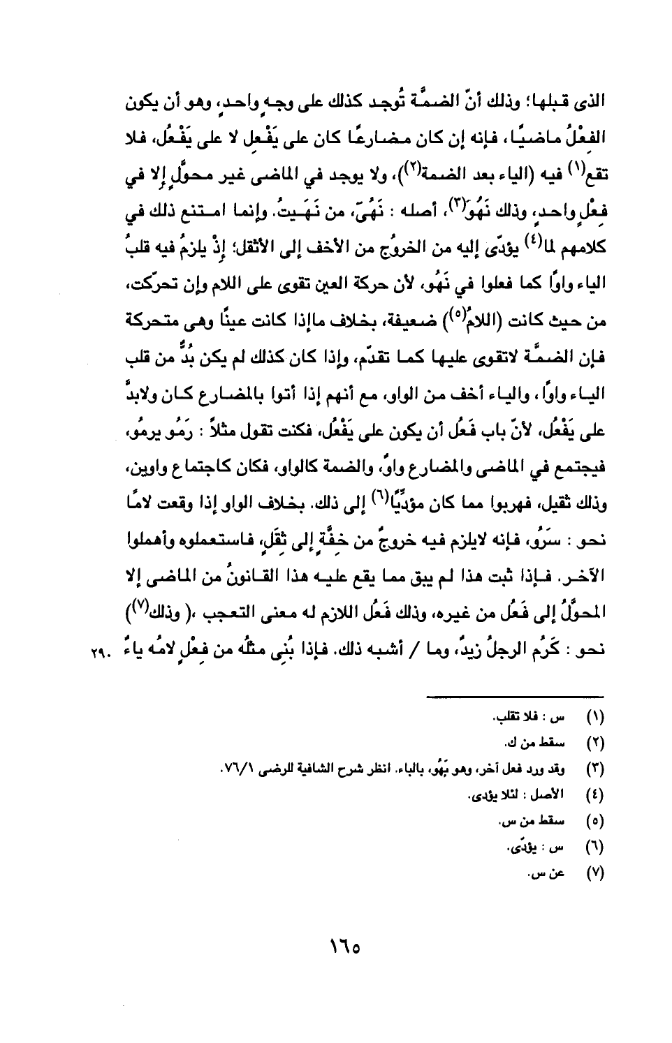 الذي قبلها؛ وذلك أن الضمة توجد كذلك على وجه واحد، وهو أن يكون الفعل ماضيا، فإنه إن كان مضارعا كان على يفعل لا على يفعل، فلا تقع فيه (الياء بعد الضمة)، ولا يوجد في الماضي غير محول إلا في فعل واحد، وذلك نهو، أصله: نهي، من نهيت. وإنما امتنع ذلك في كلامهم لما يؤدي إليه من الخروج من الأخف إلى الأثقل؛ إذ يلزم فيه قلب الياء واوا كما فعلوا في نهو، لأن حركة العين تقوى على اللام وإن تحركت، من حيث كانت (اللام) ضعيفة، بخلاف ما إذا كانت عينا وهي متحركة فإن الضمة لا تقوى عليها كما تقدم، وإذا كان كذلك لم يكن بد من قلب الياء واوا، والياء أخف من الواو، مع أنهم إذا أتوا بالمضارع كان ولابد على يفعل، لأن باب فعل أن يكون على يفعل، فكنت تقول مثلا: رمو يرمو، فيجتمع في الماضي والمضارع واو، والضمة كالواو، فكان كاجتماع واوين، وذلك ثقيل، فهربوا مما كان مؤديا إلى ذلك. بخلاف الواو إذا وقعت لاما نحو: سرو، فإنه لا يلزم فيه خروج من خفة إلى ثقل، فاستعملوه وأهملوا الآخر. فإذا ثبت هذا لم يبق مما يقع عليه هذا القانون من الماضي إلا المحول إلى فعل من غيره، وذلك فعل اللازم له معنى التعجب، (وذلك) نحو: كرم الرجل زيد، وما/ أشبه ذلك. فإذا بني مثله من فعل لامه ياء