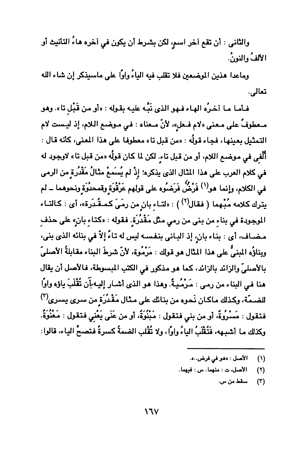 فأما ما آخره الهاء فهو الذي نبه عليه بقوله: "أو من قبل تا". وهو معطوف على معنى "لام فعل"، لأن معناه: في موضع اللام، إذ ليست لام التمثيل بعينها، فجاء قوله: "من قبل تا" معطوفا على هذا المعنى، كأنه قال: ألفى في موضع اللام، أو من قبل تاء. لكن لما كان قوله "من قبل تا" لا وجود له في كلام العرب على هذا المثال الذي يذكره؛ إذ لم يسمع مثال مقدرة من الرمي في الكلام، وإنما هو فرض فرضوه على قولهم عرقوة وقمحدوة ونحوهما- لم يترك كلامه مبهما (فقال): "لتاء بان من رمى كمقدرة"، أي: كالتاء الموجودة في بناء من بنى من رمى مثل مقدرة. فقوله: "كتاء بان" على حذف مضاف، أي: بناء بان، إذ الباني بنفسه ليس له تاء إلا في بنائه الذي بني، وبناؤه المبني على هذا المثال هو قولك: مرموة، لأن شرط البناء مقابلة الأصلي بالأصلي والزائد بالزائد، كما هو مذكور في الكتب المبسوطة، فالأصل أن يقال هنا في البناء من رمى: مرمية. وهذا الذي أشار إليه بأن تقلب ياؤه واوا للضمة، وكذلك ما كان نحوه من بنائك على مثال مقدرة من سرى يسري فتقول: مسروة، أو من بني فتقول: مبنوة أو من عنى يعني فتقول: معنوة. وكذلك ما أشبهه، فتقلب الياء واوا، ولا تقلب الضمة كسرة فتصح الياء، قالوا: