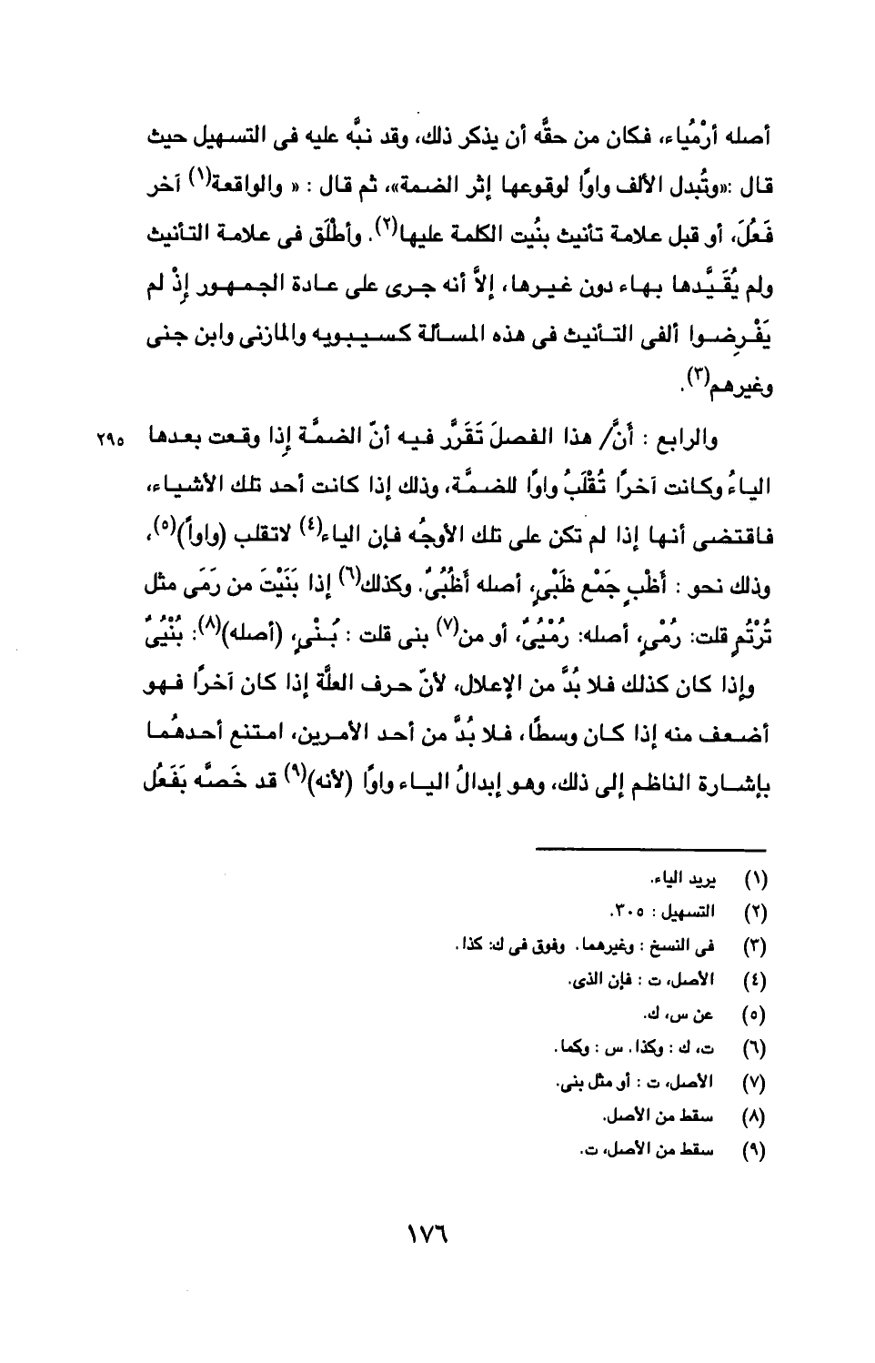 أصله أرمياء، فكان من حقه أن يذكر ذلك، وقد نبه عليه في التسهيل حيث قال: "وتبدل الألف واوا لوقوعها إثر الضمة"، ثم قال: "والواقعة آخر فعل، أو قبل علامة تأنيث بنيت الكلمة عليها. وأطلق في علامة التأنيث ولم يقيدها بهاء دون غيرها، إلا أنه جرى على عادة الجمهور إذ لم يفرضوا ألفي التأنيث في هذه المسألة كسيبويه والمازني وابن جني وغيرهم.