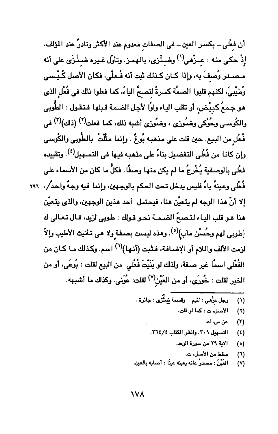 أن فِعْلى- بكسر العين- في الصفات معدوم عند الأكثر ونادر عند المؤلف، إذ حكي منه: عزهى وضئزى، بالهمز. وتأول غيره ضئزى على أنه مصدر وصف به، وإذا كان كذلك ثبت أنه فعلى، فكان الأصل كيسي وطيبي، لكنهم قلبوا الصمة كسرة لتصح الياء، كما فعلوا ذلك في فعل الذي هو جمع كبيض، أو تقلب الياء واوا لأجل الضمة قبلها فتقول: الطوبي والكوسي وحوكي وضوزي، وضوزي أشبه بذلك، كما فعلت (ذلك) في فعل من البيع. حين قلت على مذهبه بوغ. وإنما مثلت بالطوبي والكوسي وإن كانا من فعلي التفضيل بناء على مذهبه فيها في التسهيل. وتقييده فعلي بالوصفية يخرج ما لم يكن منها وصفا. فكل ما كان من الأسماء على فعلى وعينه ياء فليس يدخل تحت الحكم بالوجهين، وإنما فيه وجه واحد/، إلا أن هذا الوجه لم يتعين هنا، فيحتمل أحد هذين الوجهين، والذي يتعين هنا هو قلب الياء لتصح الضمة نحو قولك: طوبي لزيد، قال تعالى ك {طوبي لهم وحسن مآب}. وهذه ليست بصفة ولا هي تأنيث الأطيب وإلا لزمت الألف واللام أو الإضافة، فثبت (أنها) اسم. وكذلك ما كان من الفعلى اسما غير صفة، ولذلك لو بنيت فعلي من البيع لقلت: بوعى، أو من الخير لقلت: خوري، أو من العين لقلت: عوني. وكذلك ما أشبهه.