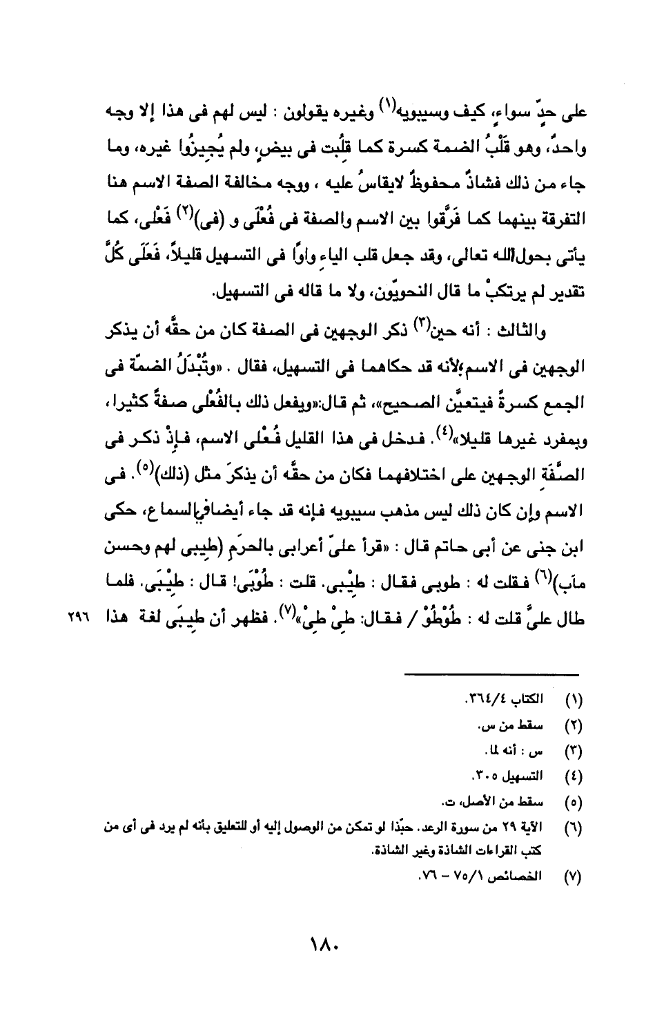 والثالث: أنه حين ذكر الوجهين في الصفة كان من حقه أن يذكر الوجهين في الاسم؛ لأنه قد حكاهما في التسهيل، فقال: "وتبدل الضمة في الجمع كسرة فيتعين الصحيح"، ثم قال: "ويفعل ذلك بالفعلي صفة كثيرا، وبمفرد غيرها قليلا". فدخل في هذا القليل فعلي الاسم، فإذ ذكر في الصفة الوجهين على اختلافهما فكان من حقه أن يذكر مثل (ذلك). في الاسم وإن كان ذلك ليس مذهب سيبويه فإنه قد جاء أيضا في السماع، فكي ابن جني عن أبي حاتم قال: "قرأ على أعرابي بالحرم (طيبى لهم وحسن مآب) قفلت له: طوبي فقال: طيبى. قلت: طوبى! قال: طيبى. فلما طال على قلت له: طوطو/ فقال: طي طي". فظهر أن طيبي لغة هذا