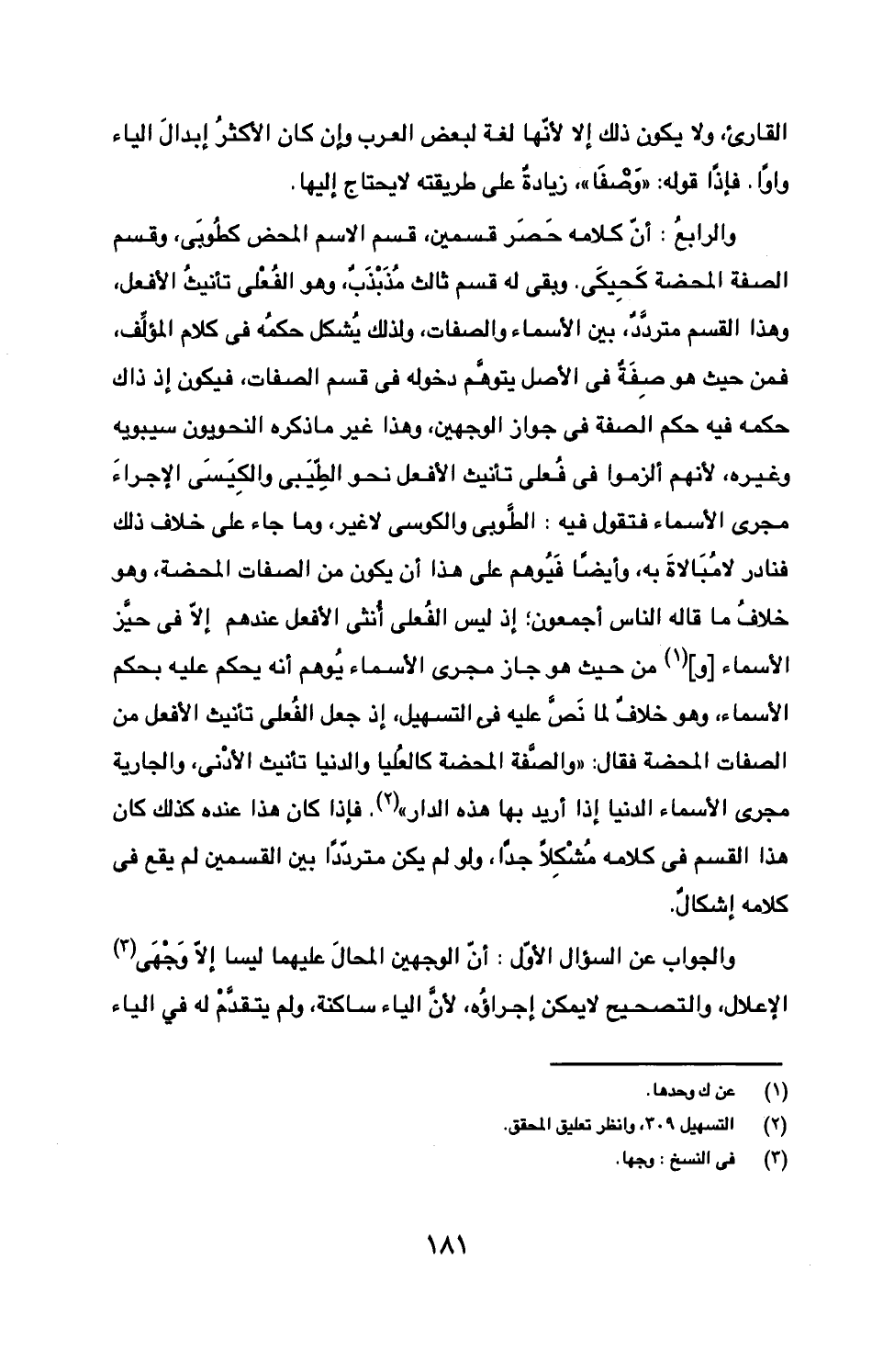 والرابع: أن كلامه حصر قسمين، قسم الاسم المحض كطوبي، وقسم الصفة المحضة كحيكى. وبقى له قسم ثالث مذبذب، وهو الفعلى تأنيث الأفعل، وهذا القسم متردد، بين الأسماء والصفات، ولذلك يشكل حكمه في كلام المؤلف، فمن حيث هو صفة في الأصل يتوهم دخوله في قسم الصفات، فيكون إذ ذاك حكمه فيه حكم الصفة في جواز الوجهين، وهذا غير ما ذكره النحويون سيبويه وغيره، لأنهم ألزموا في فعلي تأنيث الأفعل نحو الطيبي والكيسي الإجراء مجرى الأسماء فتقول فيه: الطوبي والكوسي لا غير، وما جاء على خلاف ذلك فنادر لامبالاة به، وأيضا فيوهم على هذا أن يكون من الصفات المحضة، وهو خلاف ما قاله الناس أجمعون؛ إذ ليس الفعلي أنثى الأفعل عندهم إلا في حيز الأسماء [و] من حيث هو جاز مجرى الأسماء يوهم أنه يحكم عليه بحكم الأسماء، وهو خلاف لما نص عليه في التهسيل، إذا جعل الفعلي تأنيث الأفعل من الصفات المحضة فقال: "والصفة المحضة كالعليا والدنيا تأنيث الأدنى، والجارية مجرى الأسماء الدنيا إذا أريد بها هذه الدار". فإذا كان هذا عنده كذلك كان هذا القسم في كلامه مشكلا جدا، ولو لم يكن مترددا بين القسمين لم يقع في كلامه إشكال.