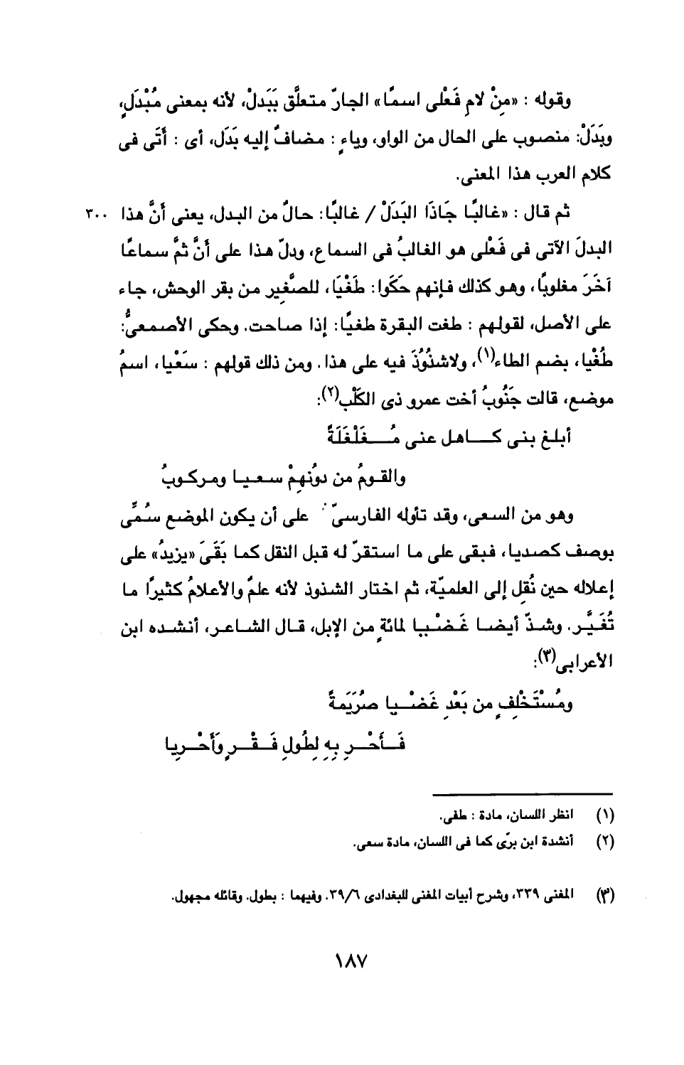 ثم قال: "غالبا جاذا البدل/ غالبا: حال من البدل، يعني أن هذا البدل الآتي في فعلي هو الغالب في السماع، ودل هذا على أن ثم سماعا آخر مغلوبا، وهو كذلك فإنهم حكوا: طغيا، للصغير من بقر الوحش، جاء على الأصل، لقولهم: طغت البقرة طغيا: إذا صاحت. وحكي الأصعمي: طغيا، بضم الطاء، ولا شذوذ فيه على هذا. ومن ذلك قولهم: سعيا، اسم موضع، قالت جنوب أخت عمرو ذي الكلب: