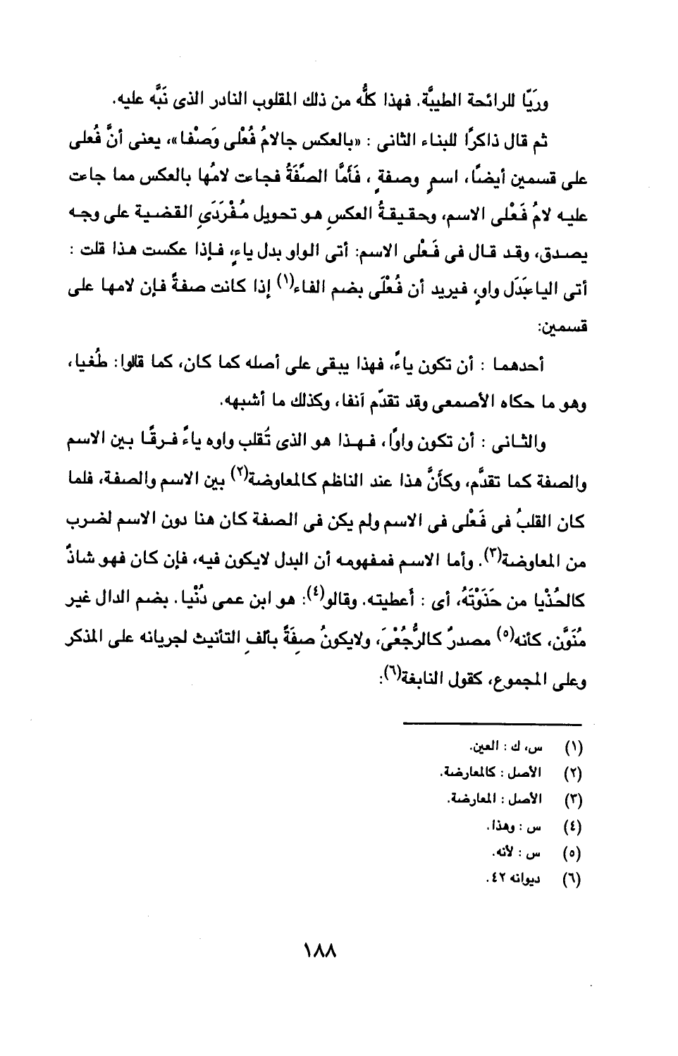 والثاني: أن تكون واوا، فهذا هو الذي تقلب واوه ياء فرقا بين الاسم والصفة كما تقدم، وكان هذا عند الناظم كالمعاوضة بين الاسم والصفة، فلما كان القلب في فعلي في الاسم ولم يكن في الصفة كان هنا دون الاسم لضرب من المعاوضة. وأما الاسم فمفهومه أن البدل لا يكون فيه، فإن كان فهو شاذ كالحذيا من حذوته، أي: أعطيته. وقالو: هو ابن عمي دنيا. بضم الدال غير منون، كأنه مصدر كالرجعى، ولا يكون صفة بألف التأنيث لجريانه على المذكر وعلى المجموع، كقول النابغة: