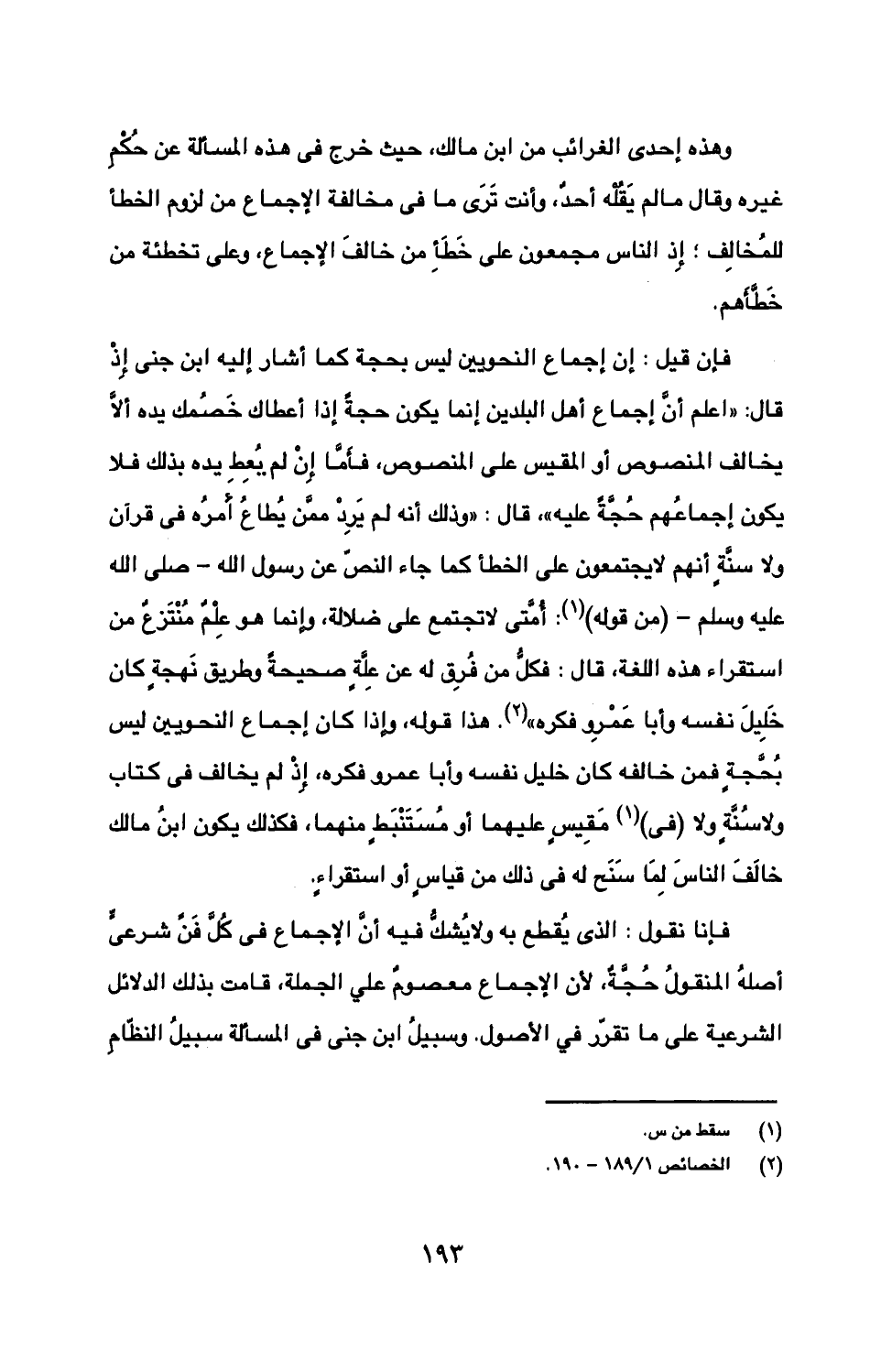 فإنا نقول: الذي يقطع به ولا يشك فيه أن الإجماع في كل فن شرعي أصله المنقول حجة، لأن الإجماع معصوم على الجملة، قامت بذلك الدلائل الشرعية على ما تقرر في الأصول. وسبيل ابن جني في المسألة سبيل النظام